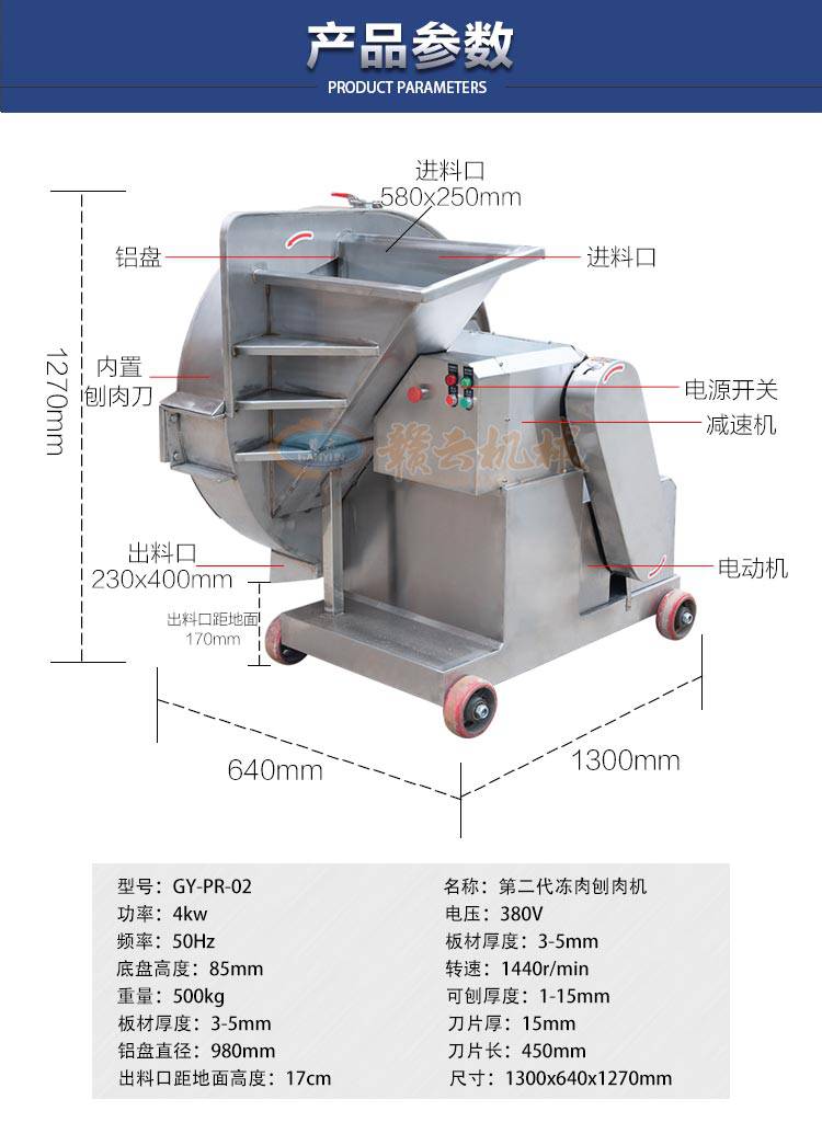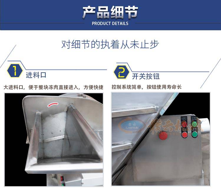 1:赣云牌第二代刨肉机是江西赣云食品机械有限公司生产的一款冻肉刨肉设备;整体机身采用加厚不锈钢精心制造;外表美观大方,坚固耐用,清洗方便;