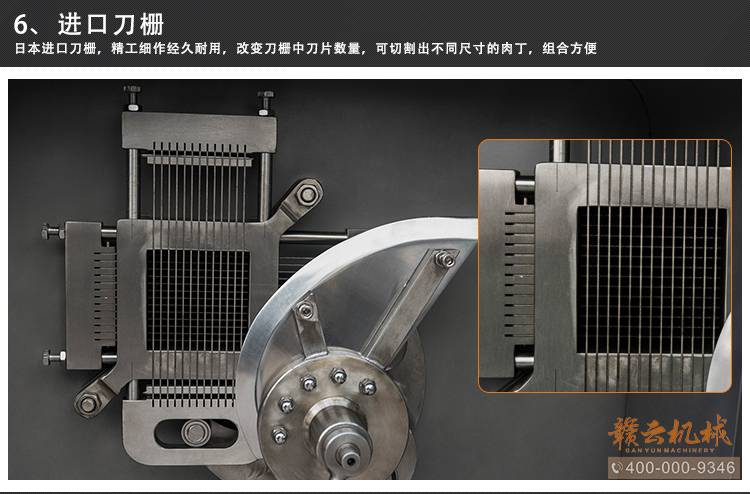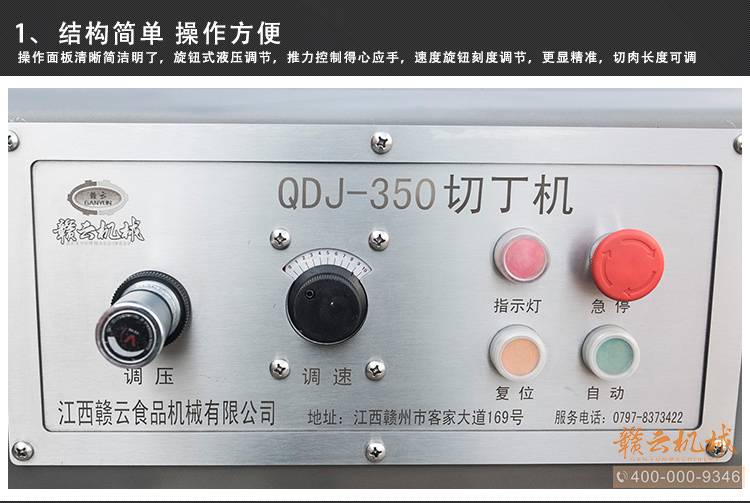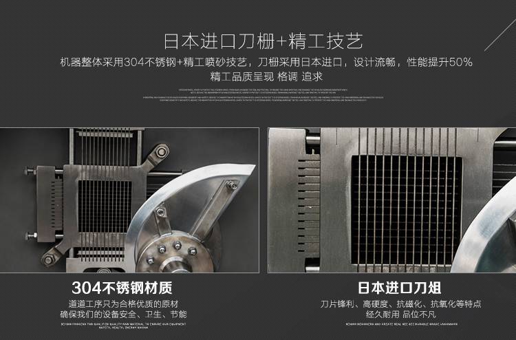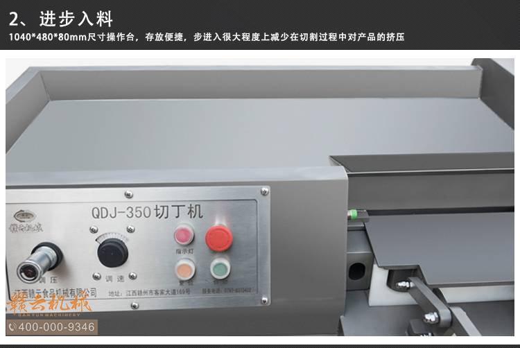 2:赣云牌550型切肉丁机采用不锈钢喷砂处理技术,装备日本原装进口刀组,利用流水线条设计,配合激光雕刻控制面板,整体外形美观大气,清洗方便,不易腐蚀;