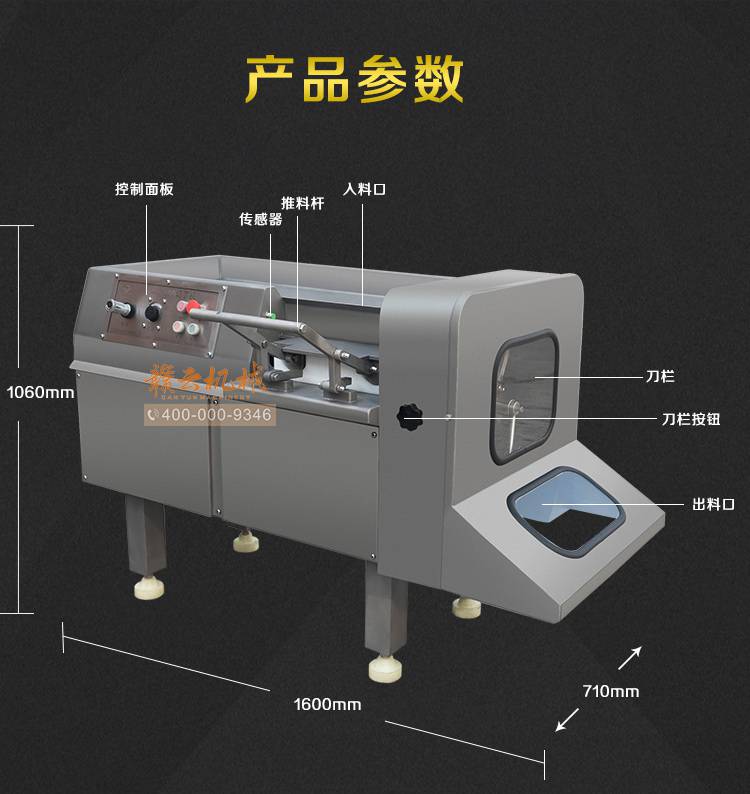 3:大功率纯铜电机,动力强劲,运行稳定,使用寿命长;液压步进式推料自动切割,推料速度旋钮可调,拆增刀片可切出多种肉丁,肉条,肉片。