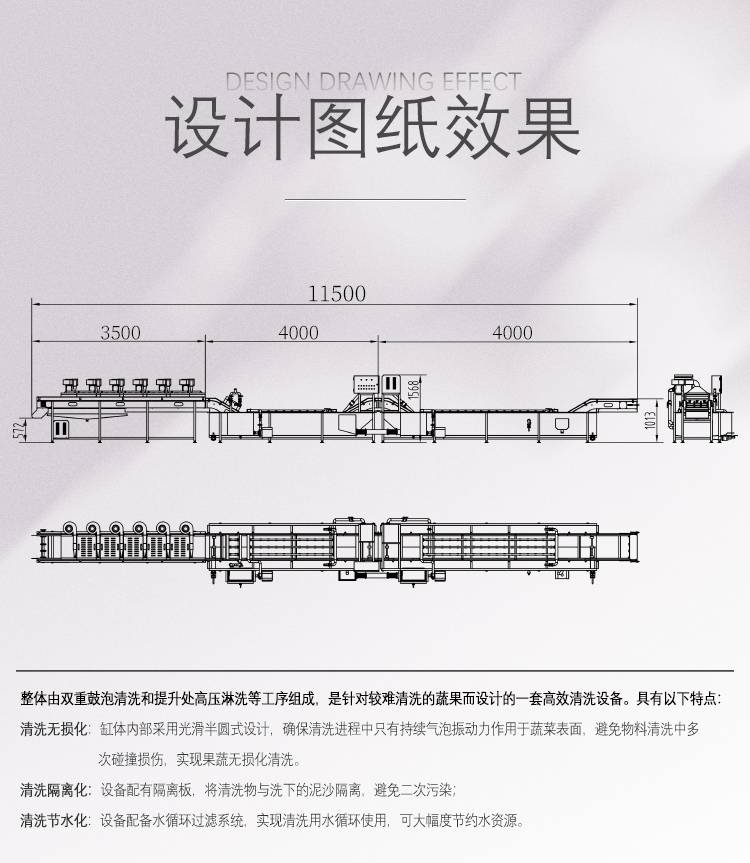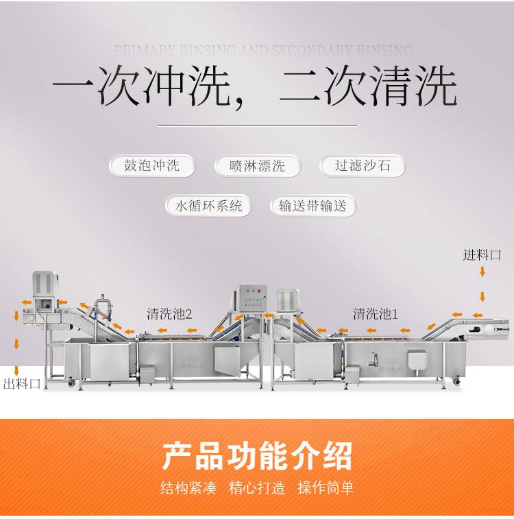赣云牌中央厨房净菜加工设备果蔬无损清洗线机器特点: