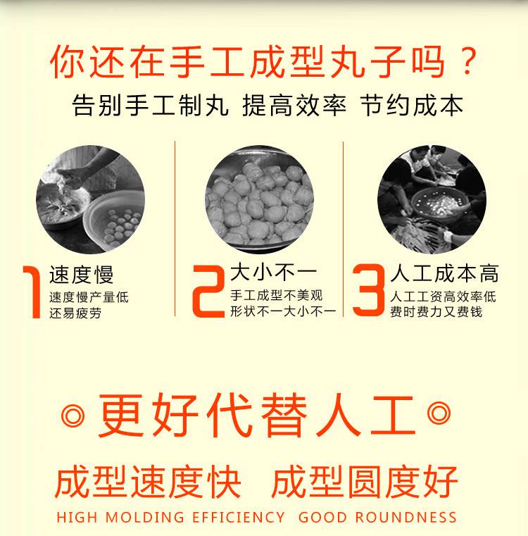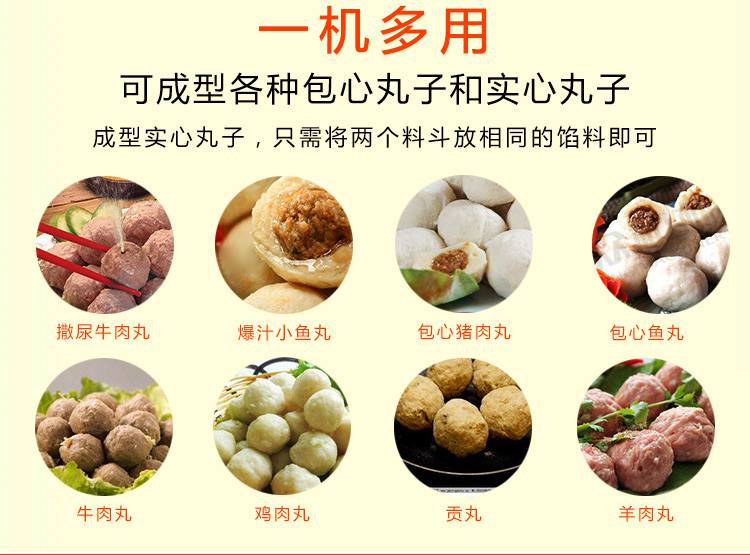 2:这款包心肉丸成型机不仅可以做包心丸子,还可以做各类的实心丸子,只需要将两个料斗放同一馅料就可以生产实心丸子;适用于肉制品加工厂;餐厅;超市;食堂;酒店;市场;半成品配送中心;火锅店等餐饮服务单位;