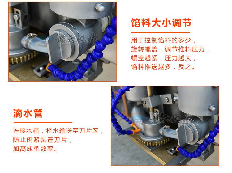 5:自带水箱,无需另接水龙头,水箱连接的水管带阀门,不用时关闭阀门,节水方便;可拆卸料斗,清洗方便,馅料不残留,卫生安全;