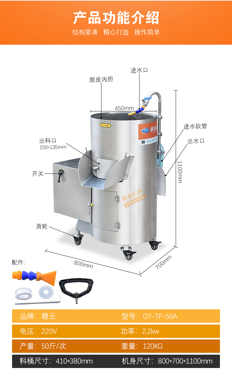 本机器具有良好的防锈.防腐.耐磨损等特点.去皮快速,清洁卫生,可以脱毛芋头皮,土豆(马铃薯)皮等,高速脱皮/去皮,每次只需2-5分钟,一次可以脱皮50-200斤,性能稳定操作简便,安全,可确保去皮质量,且省电省水省时间 适合农产品加工单位及个体加工经营,脱皮后的芋子.土豆等,可以散装或袋装在各超市菜市场 批.