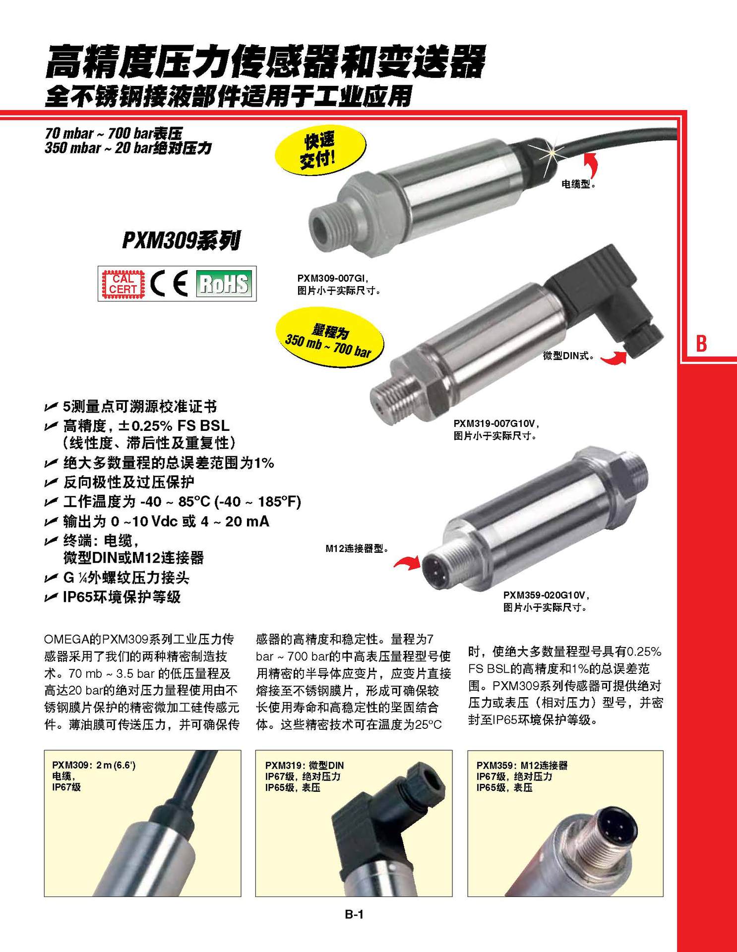 OMEGA的PXM309系列工业压力传感器采用了我们的两种精密制造技 术。70 mb ~ 3.5 bar 的低压量程及 高达20 bar的压力量程使用由不 锈钢膜片保护的精密微加工硅传感元 件。薄油膜可传送压力,并可确保传 感器的高精度和稳定性。量程为7 bar ~ 700 bar的中高表压量程型号使 用精密的半导体应变片,应变片直接 熔接至不锈钢膜片,形成可确保较 长使用寿命和高稳定性的坚固结合 体。这些精密技术可在温度为25oC 时,使绝大多数量程型号具有0.25% FS BSL的高精度和1%的总误差范 围。PXM309系列传感器可提供 压力或表压(相对压力)型号,并密 封至IP65环境保护等级。