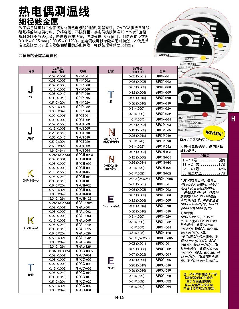 为了满足科研和工业领域对热电偶线的随时随量需求,OMEGA供应各种线径规格的热电偶材料,价格合理,不限订量。热电偶线以标准76 mm (3")直径塑料线轴卷形式供货,热电偶线非绝缘,连续长度15 m (50')。测温线直径范围0.013 ~ 3.25 mm (0.0005 ~ 0.128")。热电偶线可以单独或配对供货,以满足标准误差限要求。其它线径和数量的热电偶线,可以按照特殊要求供货。