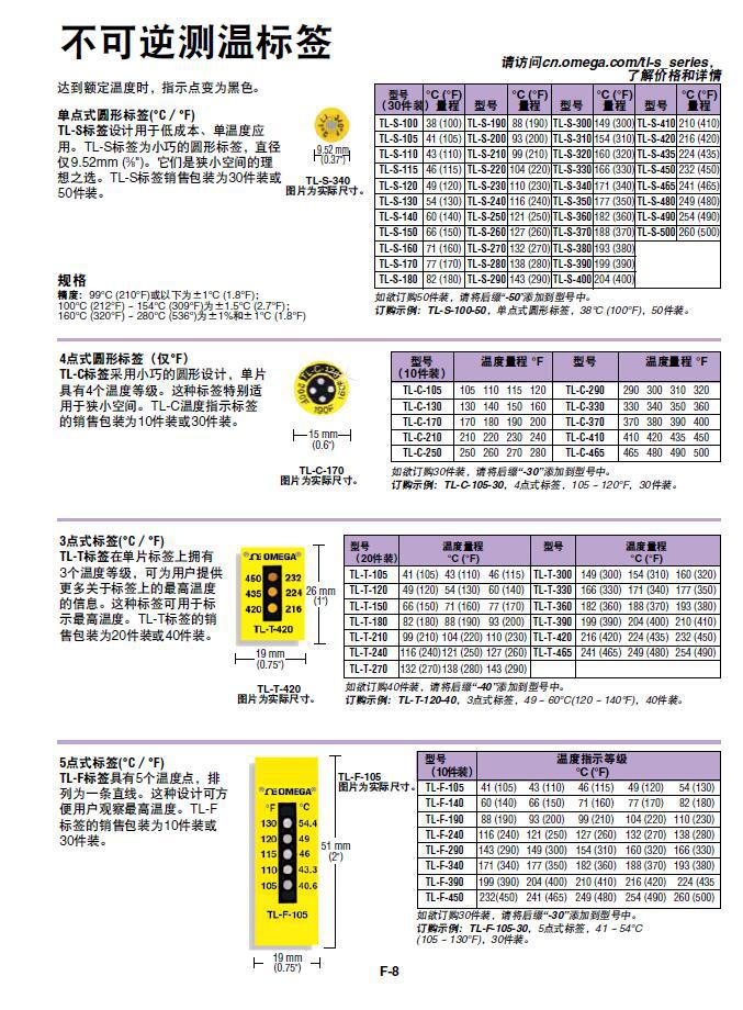 TL-S标签设计用于低成本、单温度应用。TL-S标签为小巧的圆形标签,直径仅9.52mm (3?8")。它们是狭小空间的理想之选。TL-S标签销售包装为30件装或50件装。
