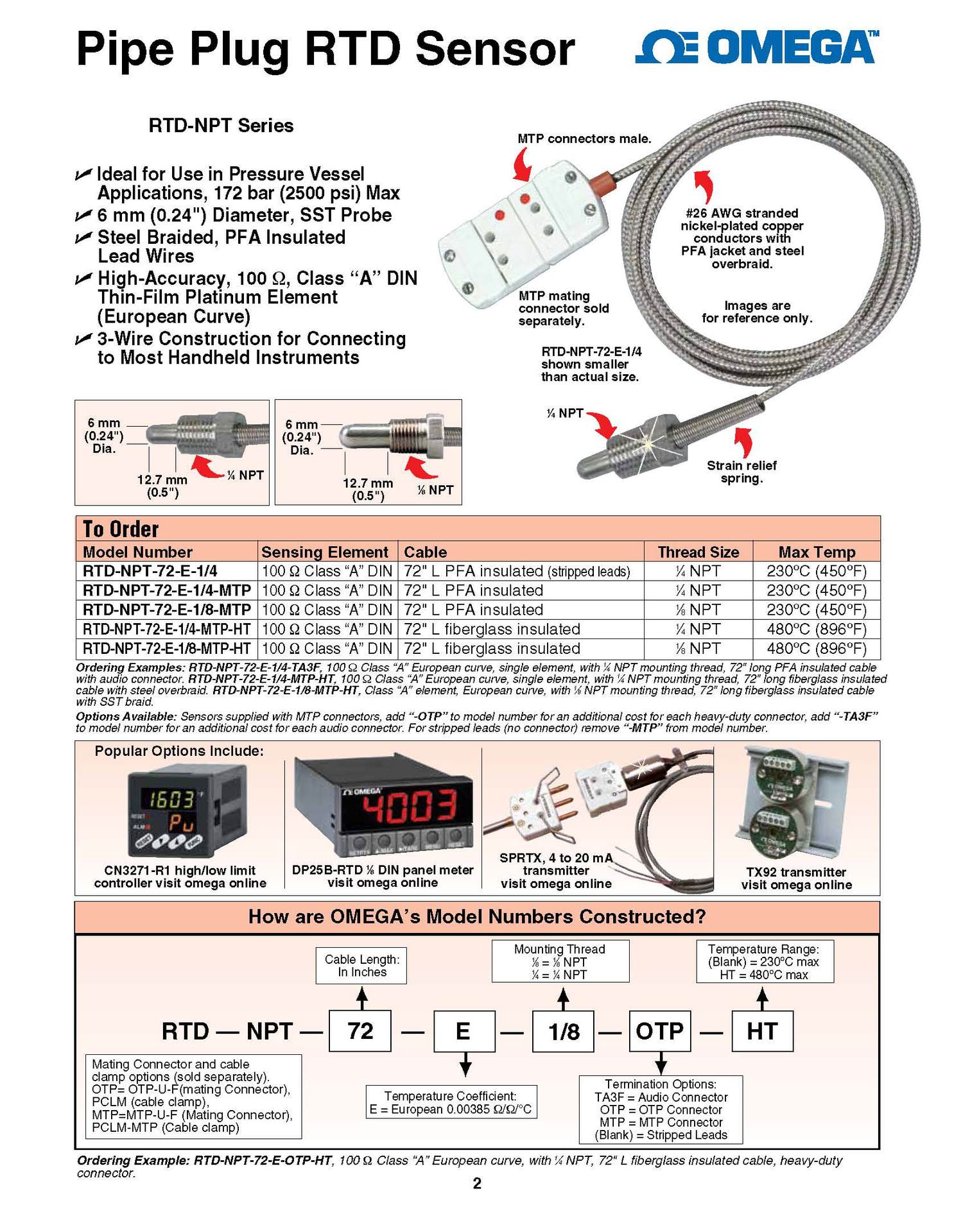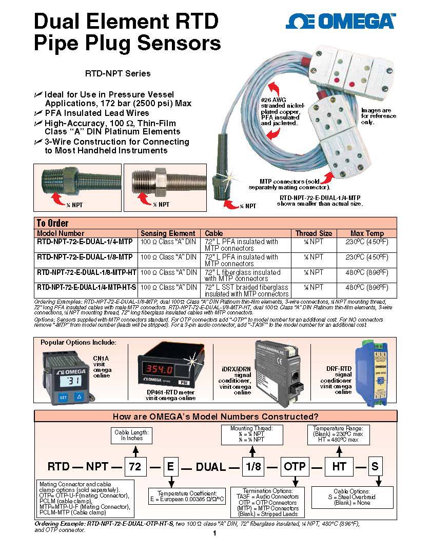 该RTD插头传感器是压力容器应用,压力容器和需要带NPT安装接头的温度传感器的应用的理想选择。 单个元件设计有1/4”直径304不锈钢探头,可从1/4”NPT安装螺纹延伸1/2”(还可选择1/8”NPT安装螺纹)。 引线长6',为#26 AWG镀镍铜PFA绝缘护套绞合线,带钢制编织护套。 传感器具有或不具有超小型连接器。 额定压力为2500 psi,高额定温度为230°C(445°F)。