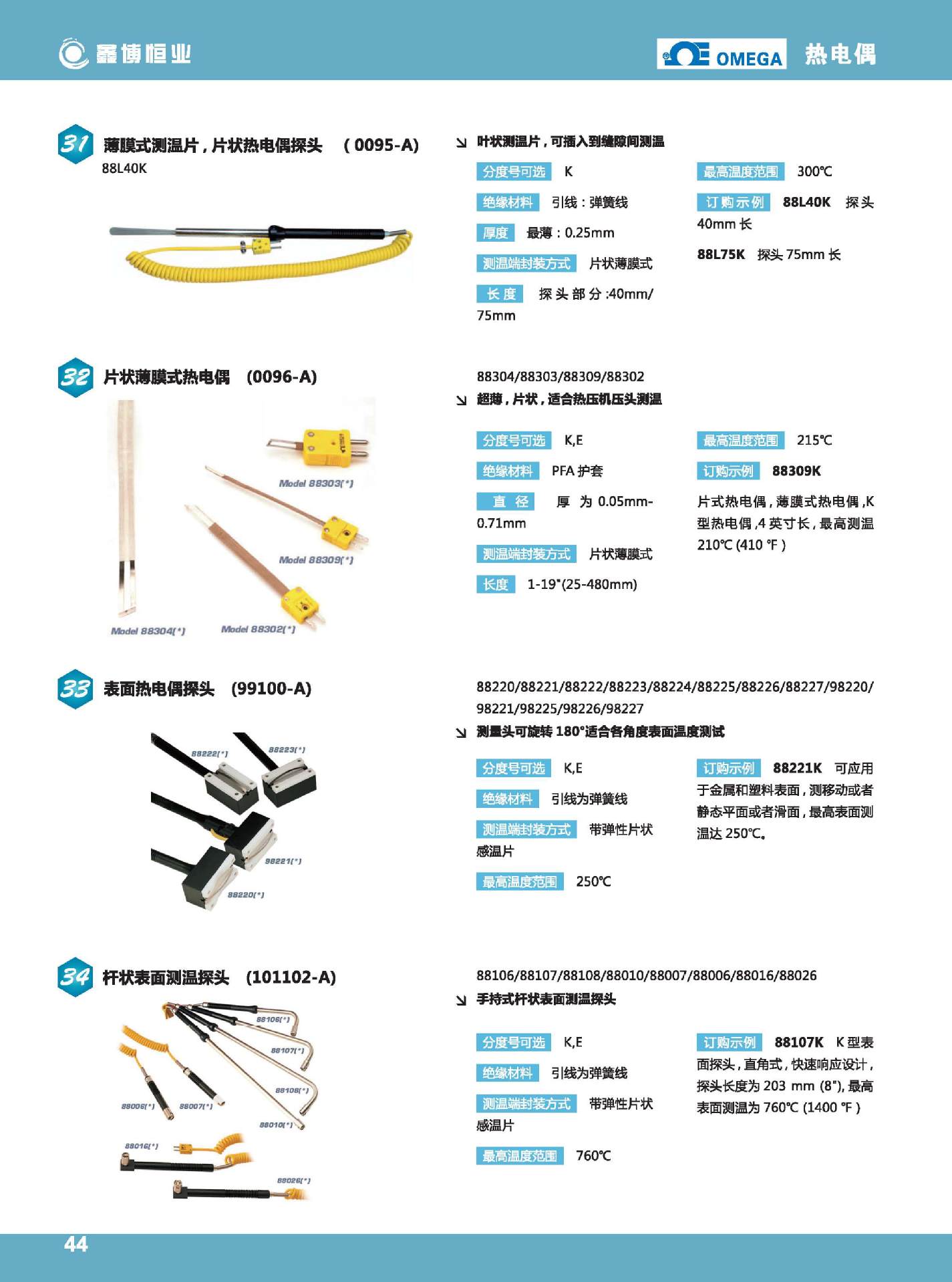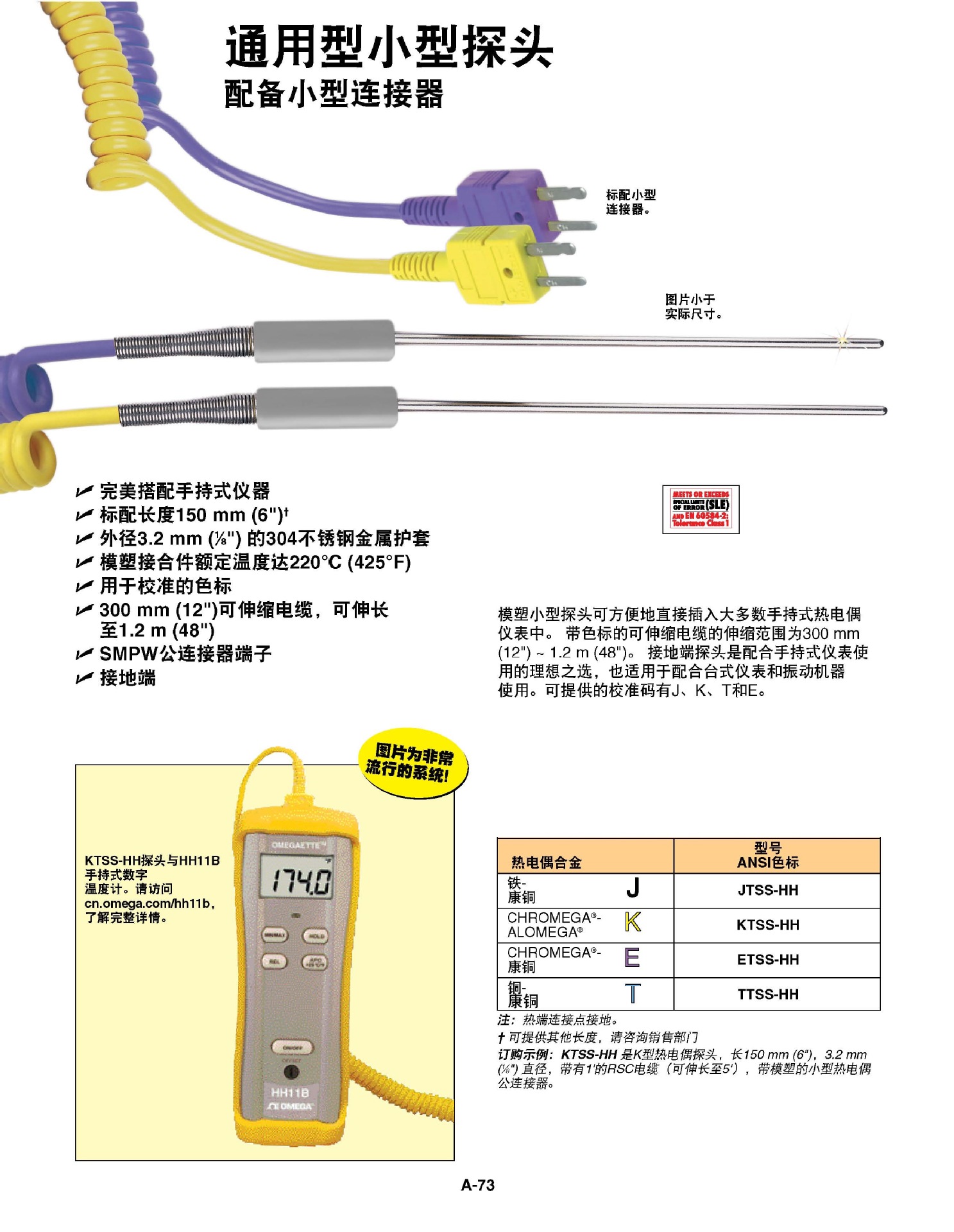 模塑小型探头可方便地直接插入大多数手持式热电偶仪表中。带色标的可伸缩电缆的伸缩范围为300 mm (12") ~ 1.2 m (48")。