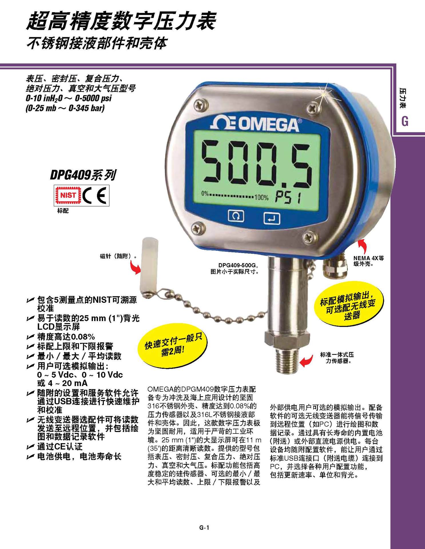 OMEGA的DPGM409数字压力表配 备专为冲洗及海上应用设计的坚固 316不锈钢外壳、精度达到0.08%的 压力传感器以及316L不锈钢接液部 件和壳体。因此,这款数字压力表极 为坚固耐用,适用于严苛的工业环 境。25 mm (1")的大显示屏可在11 m (35')的距离清晰读数。提供的型号包 括表压、密封压、复合压力、压 力、真空和大气压。标配功能包括高 度稳定的硅传感器、可选的zui小/zui 大和平均读数、上限/下限报jing以及