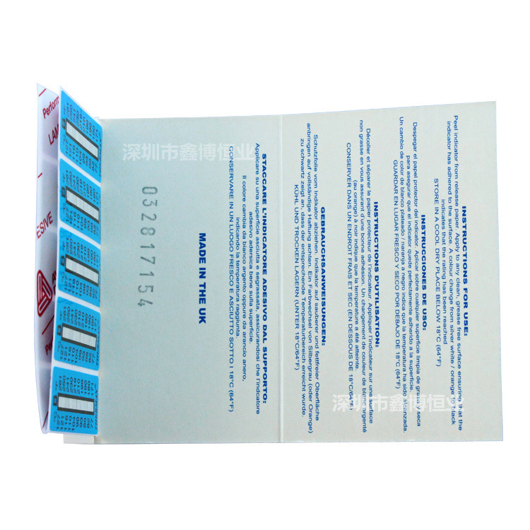每包测温纸分为(5个/8个/10个/)个小方格或者圆点,每个方格或圆点标注不同的温度值,当温度上升至该温度时,方格会转变成黑色或者灰色,即使随后温度降低,亦不会恢复成原来的颜色,如此便可知道该物体曾经到达过的高温度,不需长时间的在旁监测,就可以知道该产品是否出现超温现象,更好的监测该产品的安全问题。