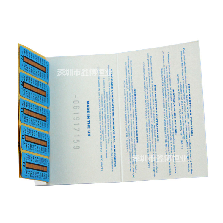 每包测温纸分为(5个/8个/10个/)个小方格或者圆点,每个方格或圆点标注不同的温度值,当温度上升至该温度时,方格会转变成黑色或者灰色,即使随后温度降低,亦不会恢复成原来的颜色,如此便可知道该物体曾经到达过的高温度,不需长时间的在旁监测,就可以知道该产品是否出现超温现象,更好的监测该产品的安全问题。