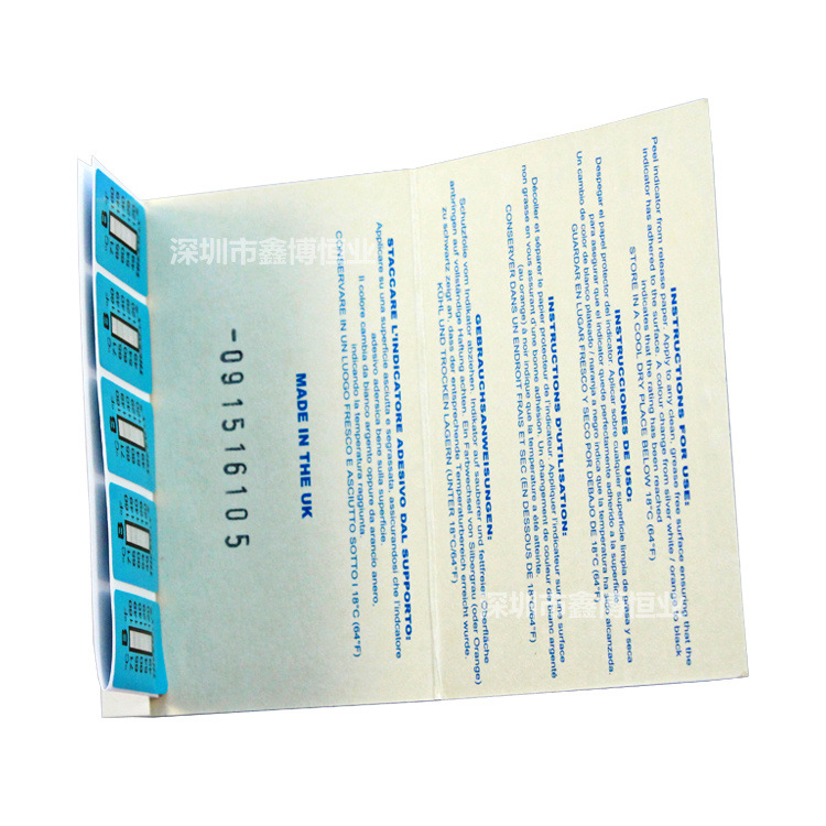 每包测温纸分为(5个/8个/10个/)个小方格或者圆点,每个方格或圆点标注不同的温度值,当温度上升至该温度时,方格会转变成黑色或者灰色,即使随后温度降低,亦不会恢复成原来的颜色,如此便可知道该物体曾经到达过的高温度,不需长时间的在旁监测,就可以知道该产品是否出现超温现象,更好的监测该产品的安全问题。
