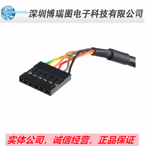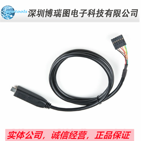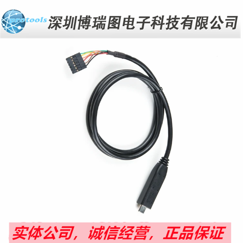 The Ftdi cable is designed around an RS232, which is housed in a USB C connector. The other side of the cable is terminated with a 0.1" pitch, 6-pin connector with the following pinout: RTS (Green), RX (Yellow), TX (Orange), VCC 5V (Red), CTS (Brown), GND (Black). This Ftdi to USB C Cable is also capable of handling high voltages up to 300V max.
