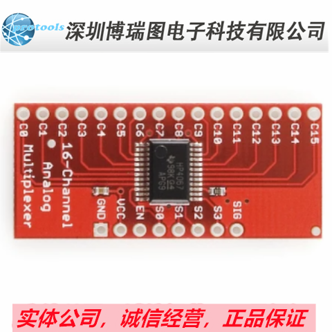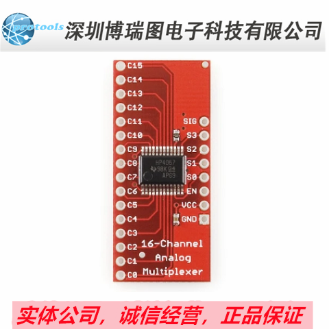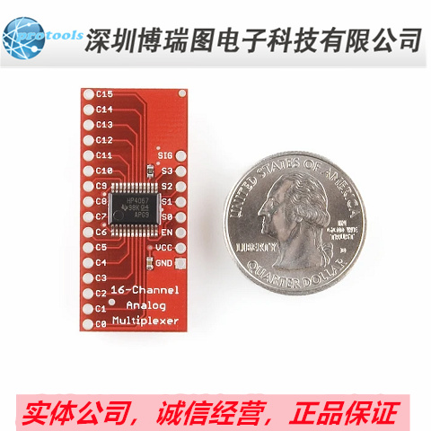 This is a breakout board for the very handy 16-Channel Analog/Digital Multiplexer/Demultiplexer CD74HC4067. This chip is like a rotary switch - it internally routes the common pin (COM in the schematic, SIG on the board) to one of 16 channel pins (CHANxx). It works with both digital and analog signals (the voltage can't be higher than VCC), and the connections function in either direction. To control it, connect 4 digital outputs to the chip's address select pins (S0-S3), and send it the binary address of the channel you want (see the datasheet for details). This allows you to connect up to 16 sensors to your system using only 5 pins!
