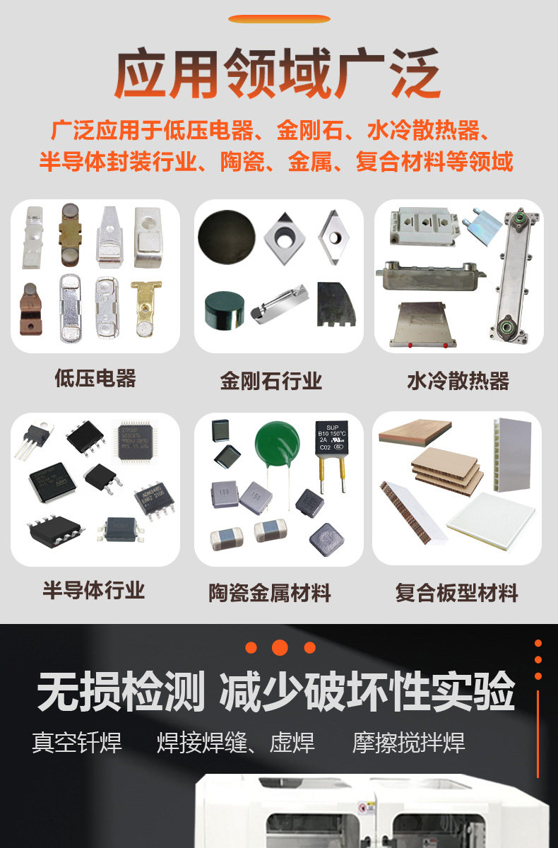 可满足低压电器焊接质量检测、金刚石缺陷和厚度测量、水冷板散热器检测、半导体封测等行业需求。
