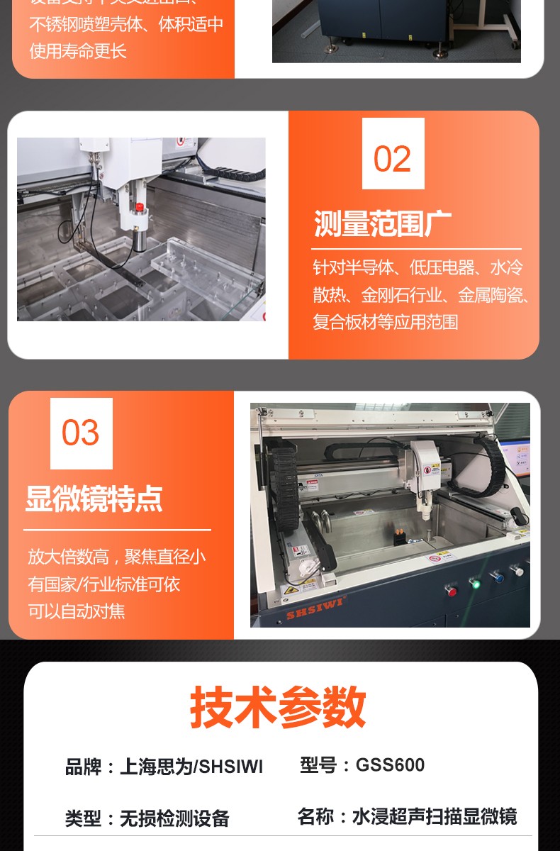 SHSIWI/上海思为仪器可为客户提供超声无损检测仪器定制、检测标准定制、检测方案及夹具定制服务。可满足低压电器焊接质量检测、金刚石缺陷和厚度测量、水冷板散热器检测、半导体封测等行业需求。