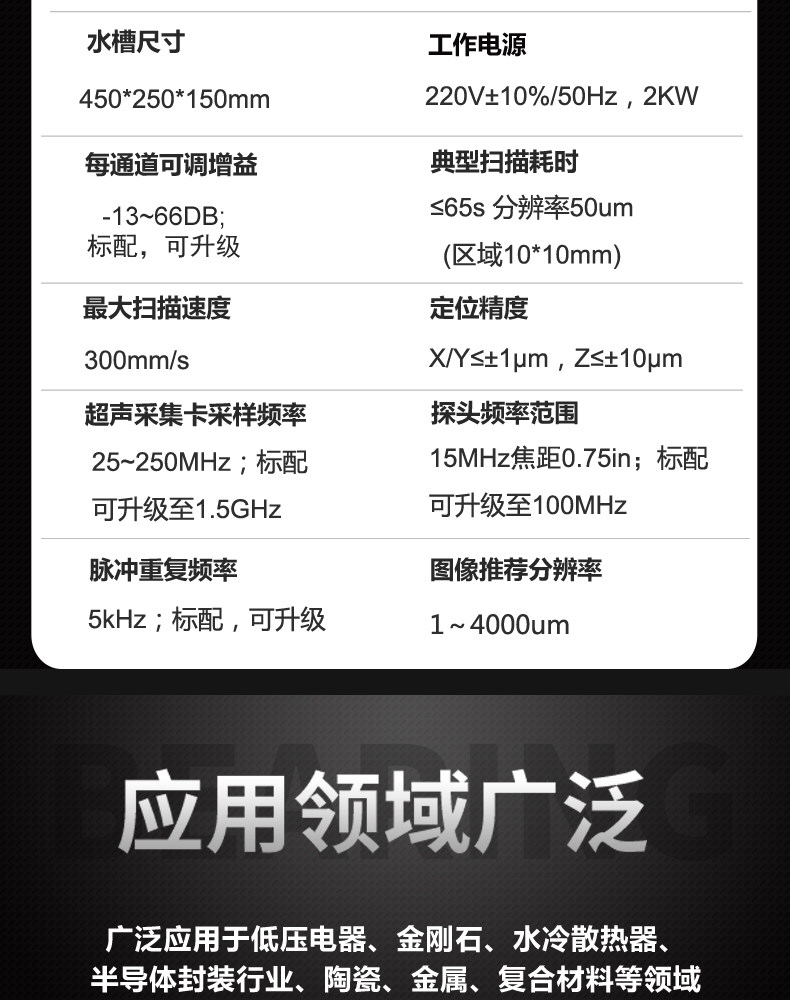 水浸超声扫描显微镜、无损检测系统一体机、水浸超声扫描显微镜、电力电子C超扫描显微镜、低压电器银点钎着率、半导体封装空洞率检测设备、聚晶金刚石复合片缺陷焊接率扫描显微镜、水冷板内部裂痕无损检测机、水冷散热器缺陷C-SAM检测设备、奥林巴斯超声探头,半导体塑封、粘片与焊接缺陷检测用超声扫描显微镜、超声无损检测设备,超声波扫描探伤仪、焊缝无损检测设备、IGBT模块焊接空洞缺陷CT无损检测设备、C-SCAN超声扫描显微镜、功率器件超声C扫描、集成电路声学扫描显微镜; 金刚石行业检测分析设备c-sam声学扫描仪;超声扫描显微镜SCAN 超声波探伤仪C-SAM 声学扫描显微镜工业CT、电子扫描显微镜、水浸超声显微镜、元器件缺陷设备、声学扫描显微镜、元器件检测分析设备、工业扫描显微镜、水浸超声c扫描工业CT、CSAM芯片分层空洞焊接、金刚石焊接检测设备、水冷散热器缺陷设备;