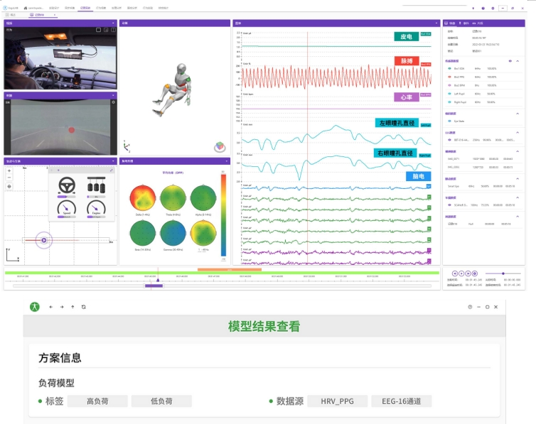ErgoLAB人机环境同步平台采用主客观结合多模态数据同步采集与多维度验证的方法,数据实时同步种类包含大脑认知数据(EEG/BCI脑电仪与脑机接口边缘计算设备、fNIRS/BCI近红外脑成像仪),视觉数据(Eyetracker眼动仪与视线交互系统),生理数据(生理仪含:GSR/EDA、EMG、ECG、EOG、HRV、RESP、TEMP/SKT、PPG、SpO2),行为观察、肢体动作与面部表情(基本情绪、情绪效价、微表情等)数据、生物力学数据(拉力、握力、捏力、压力…),人机交互数据(包含人机界面交互行为数据以及对应的键盘操作,鼠标点击、悬浮、划入划出等;移动终端人机交互行为数据以及对应的手指轨迹操作行为如点击、缩放、滑动等;VR终端界面人机交互行为数据及对应的双手操作拾取、丢弃、控制,VR空间行走轨迹)、以及多类型时空行为轨迹数据采集(包括室内、户外、以及VR环境不同时空的行走轨迹、行车轨迹、访问状态以及视线交互、情感反应、交互操作行为等数据实时同步采集)、以及作业空间及作业环境数据(温度、湿度、噪音、光照、大气压、湿度、粉尘等)等客观量化数据;为科学研究及应用提供完整的数据指标。