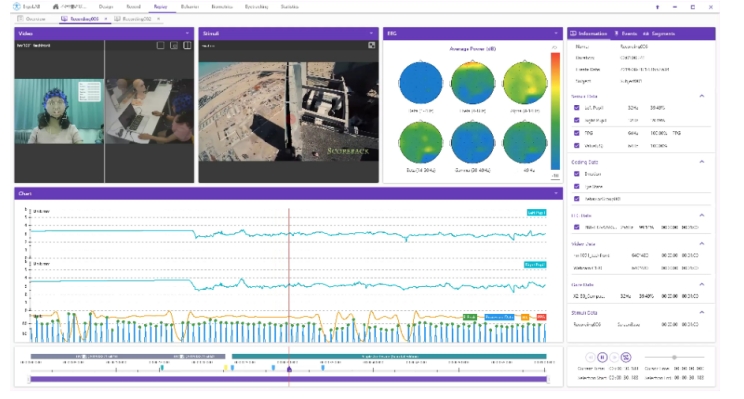 ErgoLAB人机环境同步平台采用主客观结合多模态数据同步采集与多维度验证的方法,数据实时同步种类包含大脑认知数据(EEG/BCI脑电仪与脑机接口边缘计算设备、fNIRS/BCI近红外脑成像仪),视觉数据(Eyetracker眼动仪与视线交互系统),生理数据(生理仪含:GSR/EDA、EMG、ECG、EOG、HRV、RESP、TEMP/SKT、PPG、SpO2),行为观察、肢体动作与面部表情(基本情绪、情绪效价、微表情等)数据、生物力学数据(拉力、握力、捏力、压力…),人机交互数据(包含人机界面交互行为数据以及对应的键盘操作,鼠标点击、悬浮、划入划出等;移动终端人机交互行为数据以及对应的手指轨迹操作行为如点击、缩放、滑动等;VR终端界面人机交互行为数据及对应的双手操作拾取、丢弃、控制,VR空间行走轨迹)、以及多类型时空行为轨迹数据采集(包括室内、户外、以及VR环境不同时空的行走轨迹、行车轨迹、访问状态以及视线交互、情感反应、交互操作行为等数据实时同步采集)、以及作业空间及作业环境数据(温度、湿度、噪音、光照、大气压、湿度、粉尘等)等客观量化数据;为科学研究及应用提供完整的数据指标。