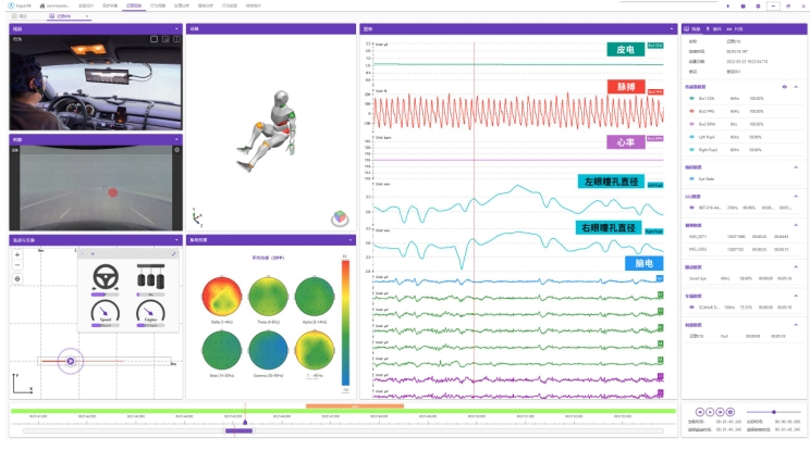 ErgoLAB人机环境同步平台采用主客观结合多模态数据同步采集与多维度验证的方法,数据实时同步种类包含大脑认知数据(EEG/BCI脑电仪与脑机接口边缘计算设备、fNIRS/BCI近红外脑成像仪),视觉数据(Eyetracker眼动仪与视线交互系统),生理数据(生理仪含:GSR/EDA、EMG、ECG、EOG、HRV、RESP、TEMP/SKT、PPG、SpO2),行为观察、肢体动作与面部表情(基本情绪、情绪效价、微表情等)数据、生物力学数据(拉力、握力、捏力、压力…),人机交互数据(包含人机界面交互行为数据以及对应的键盘操作,鼠标点击、悬浮、划入划出等;移动终端人机交互行为数据以及对应的手指轨迹操作行为如点击、缩放、滑动等;VR终端界面人机交互行为数据及对应的双手操作拾取、丢弃、控制,VR空间行走轨迹)、以及多类型时空行为轨迹数据采集(包括室内、户外、以及VR环境不同时空的行走轨迹、行车轨迹、访问状态以及视线交互、情感反应、交互操作行为等数据实时同步采集)、以及作业空间及作业环境数据(温度、湿度、噪音、光照、大气压、湿度、粉尘等)等客观量化数据;为科学研究及应用提供完整的数据指标。