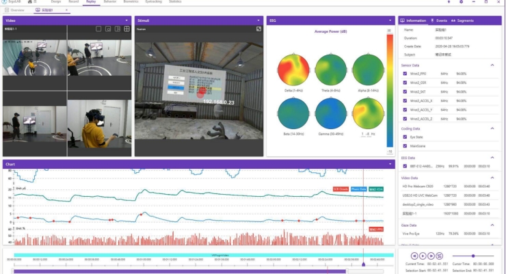 ErgoLAB人机环境同步平台采用主客观结合多模态数据同步采集与多维度验证的方法,数据实时同步种类包含大脑认知数据(EEG/BCI脑电仪与脑机接口边缘计算设备、fNIRS/BCI近红外脑成像仪),视觉数据(Eyetracker眼动仪与视线交互系统),生理数据(生理仪含:GSR/EDA、EMG、ECG、EOG、HRV、RESP、TEMP/SKT、PPG、SpO2),行为观察、肢体动作与面部表情(基本情绪、情绪效价、微表情等)数据、生物力学数据(拉力、握力、捏力、压力…),人机交互数据(包含人机界面交互行为数据以及对应的键盘操作,鼠标点击、悬浮、划入划出等;移动终端人机交互行为数据以及对应的手指轨迹操作行为如点击、缩放、滑动等;VR终端界面人机交互行为数据及对应的双手操作拾取、丢弃、控制,VR空间行走轨迹)、以及多类型时空行为轨迹数据采集(包括室内、户外、以及VR环境不同时空的行走轨迹、行车轨迹、访问状态以及视线交互、情感反应、交互操作行为等数据实时同步采集)、以及作业空间及作业环境数据(温度、湿度、噪音、光照、大气压、湿度、粉尘等)等客观量化数据;为科学研究及应用提供完整的数据指标。