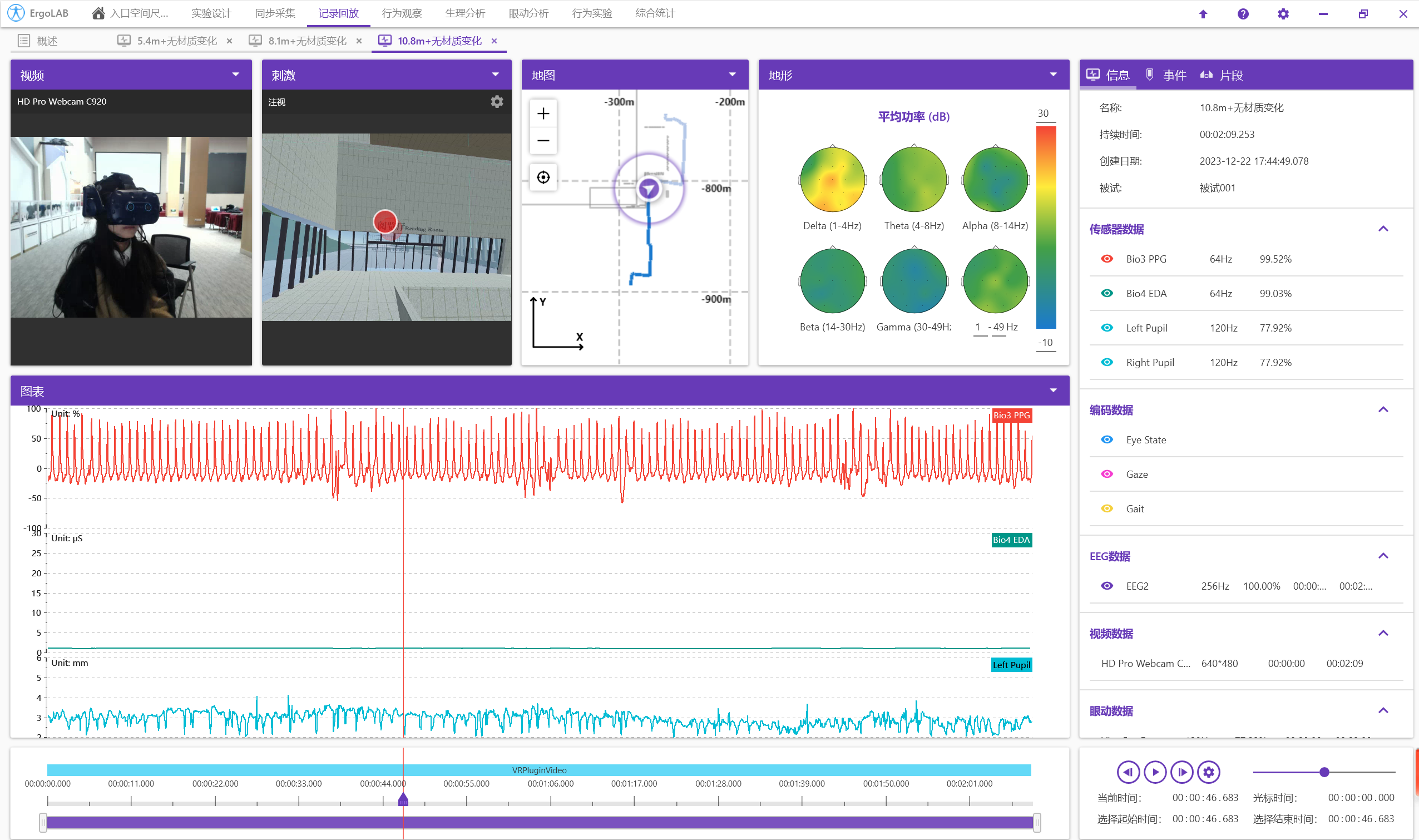 ErgoLAB人机环境同步平台采用主客观结合多模态数据同步采集与多维度验证的方法,数据实时同步种类包含大脑认知数据(EEG/BCI脑电仪与脑机接口边缘计算设备、fNIRS/BCI近红外脑成像仪),视觉数据(Eyetracker眼动仪与视线交互系统),生理数据(生理仪含:GSR/EDA、EMG、ECG、EOG、HRV、RESP、TEMP/SKT、PPG、SpO2),行为观察、肢体动作与面部表情(基本情绪、情绪效价、微表情等)数据、生物力学数据(拉力、握力、捏力、压力…),人机交互数据(包含人机界面交互行为数据以及对应的键盘操作,鼠标点击、悬浮、划入划出等;移动终端人机交互行为数据以及对应的手指轨迹操作行为如点击、缩放、滑动等;VR终端界面人机交互行为数据及对应的双手操作拾取、丢弃、控制,VR空间行走轨迹)、以及多类型时空行为轨迹数据采集(包括室内、户外、以及VR环境不同时空的行走轨迹、行车轨迹、访问状态以及视线交互、情感反应、交互操作行为等数据实时同步采集)、以及作业空间及作业环境数据(温度、湿度、噪音、光照、大气压、湿度、粉尘等)等客观量化数据;为科学研究及应用提供完整的数据指标。