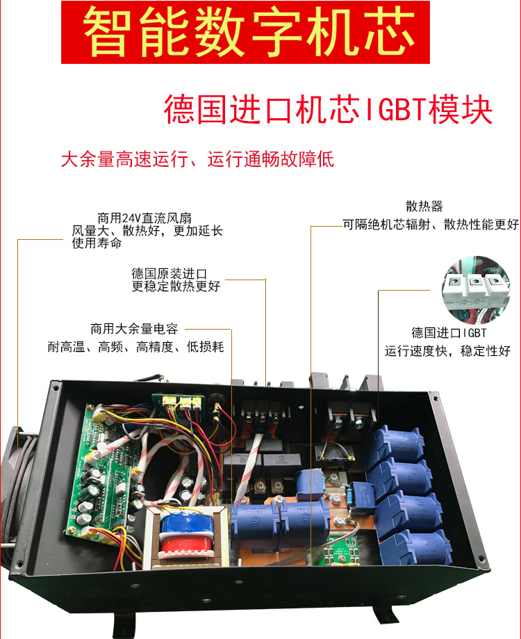 2: 机芯内部采用德国进口的Infeneon IGBT模块,具有短路,过载,过流等保护功能,质量稳定,经久耐用!
