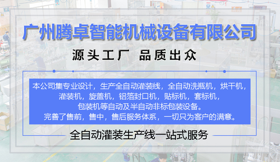 广州腾卓智能机械设备有限公司是一家制造包装设备的生产厂家,全自动及半自动的洗瓶机,烘干机,灌装机,旋盖机,贴标机,套标机,打码机等非标定制自动化包装生产线,我们拥有一支创新能力强,技术经验丰富的高级技术人才和现代化管理团队。同时具备强大的产品研发、设计、制造、销售和服务能力。