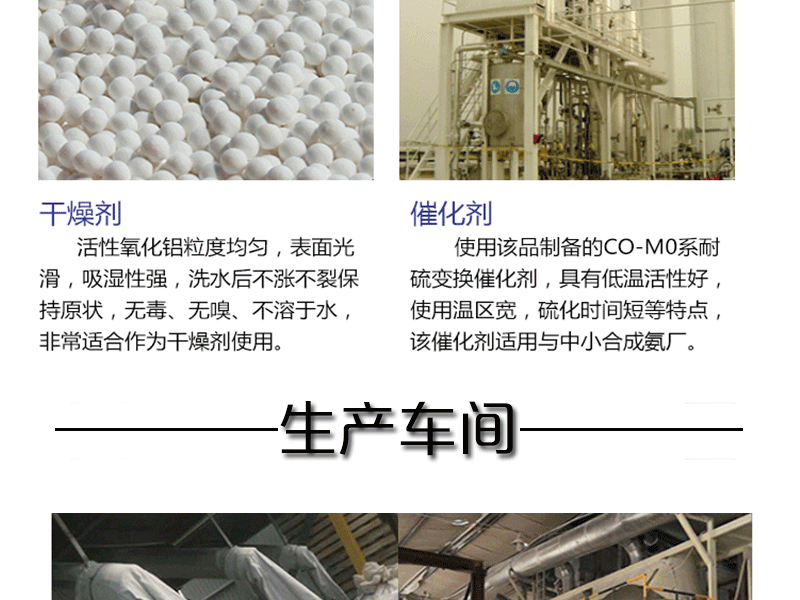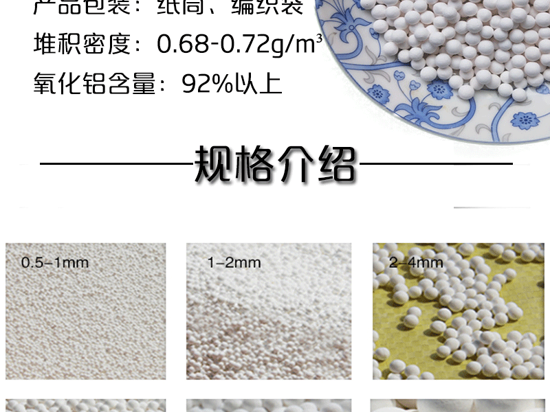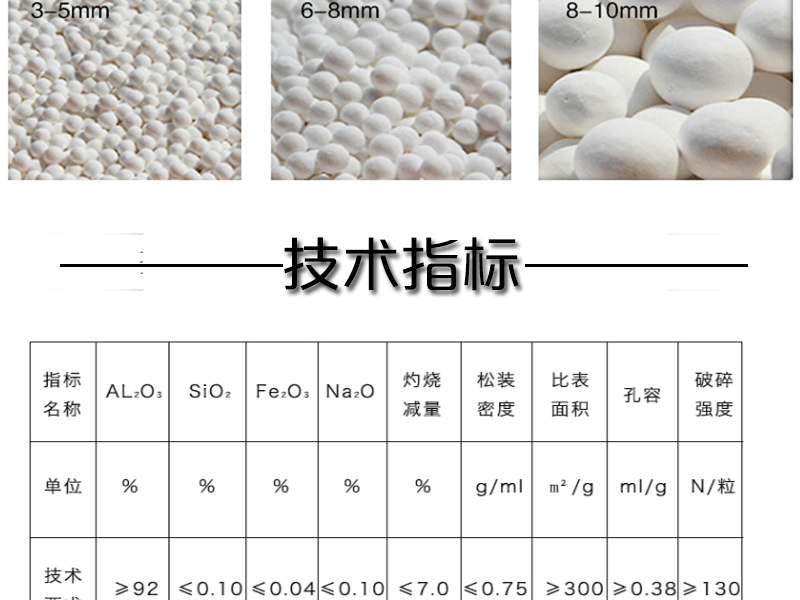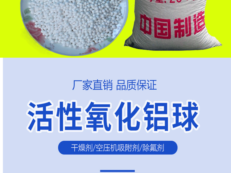 活性氧化铝是一种白色球状多孔性颗粒,粒度均匀,表面光滑,机械强度大,吸湿性强,吸水后不胀不裂保持原状,无毒,无臭,不溶于水、乙醇。它具有许多毛细孔道,比表面积大,可作为吸附剂、干燥剂及催化剂使用。同时还根据吸附物质的极性强弱来确定,对水、氧化物、醋酸、碱等具有较强的亲合力,是一种微水深度干燥剂,也是吸附极性分子的吸附剂。