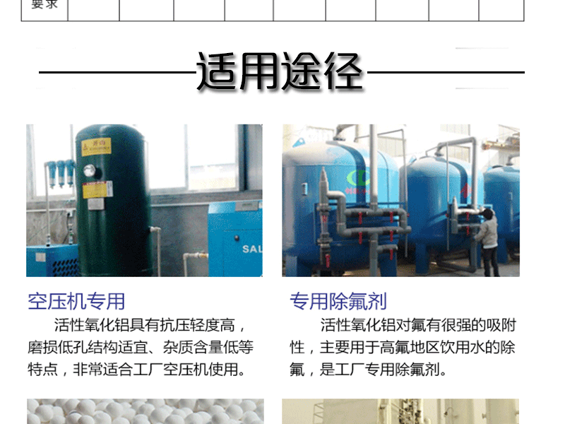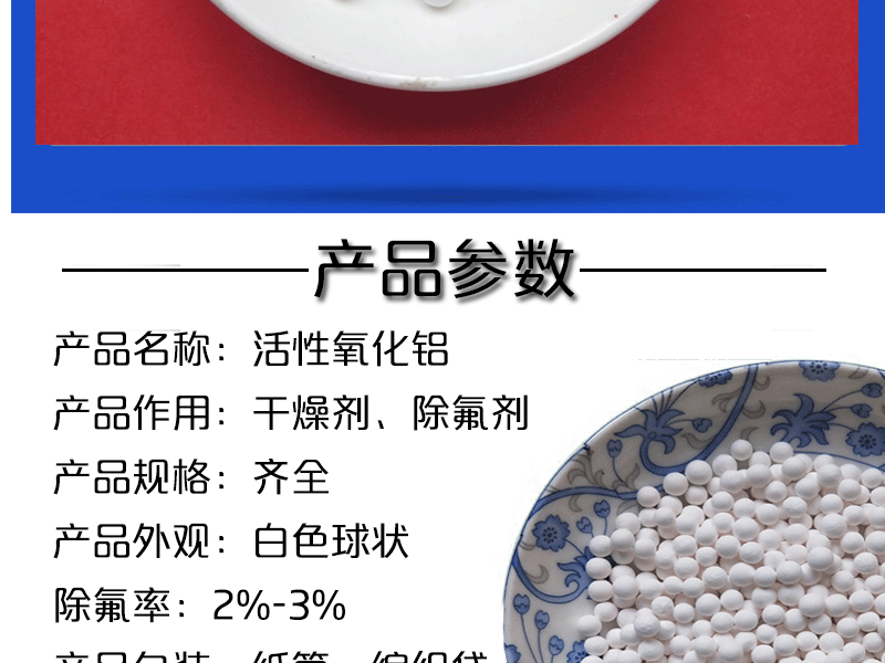 活性氧化铝除氟类似于阴离子交换树脂,但对氟离子的选择性阴离子树脂大。活性氧化铝吸附脱氟效果好,容量稳定。本产品具有强度高、磨损低、水浸不变软、不膨胀、不粉化、不破裂。可广泛用于石油裂解气、乙烯丙烯气的深度干燥和制氢、空分装置、仪表风干机的干燥、中,氟化物处理还可以去除废气中的硫气氢、二氧化硫、、烃类等污染物质,特别适应含氟水的除氟处理。