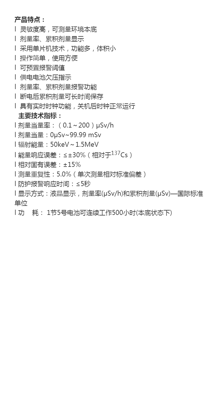 l 灵敏度高,可测量环境本底l 剂量率、累积剂量显示l 采用单片机技术,功能多,体积小l 操作简单,使用方便l 可预置报警阈值l 供电电池欠压指示l 剂量率、累积剂量报警功能l 断电后累积剂量可长时间保存l 具有实时时钟功能,关机后时钟正常运行 主要技术指标:l 剂量当量率:(0.1~200)μSv/hl 剂量当量:0μSv~99.99 mSvl 辐射能量:50keV~1.5MeVl 能量响应误差:≤±30%(相对于137Cs)l 相对固有误差:±15%l 测量重复性:5.0%(单次测量相对标准偏差)l 防护报警响应时间:≤5秒l 显示方式:液晶显示,剂量率(μSv/h)和累积剂量(μSv)—国际标准单位l 功 耗: 1节5号电池可连续工作500小时(本底状态下)