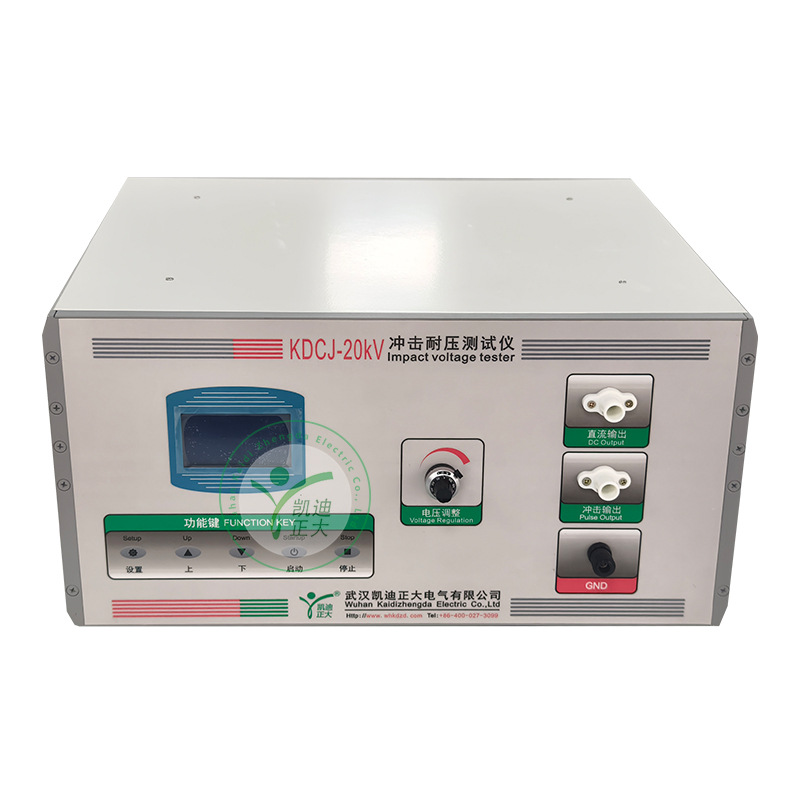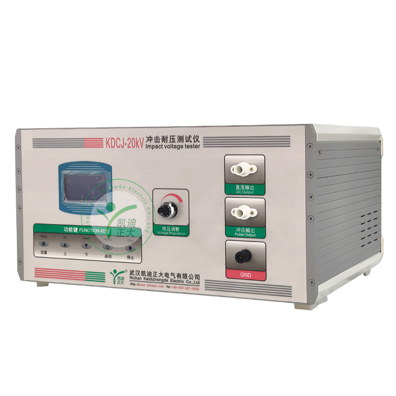 凯迪正大KDCJ-20kV 冲击耐压测试仪基于高速单片机控制,配置液晶触控屏人机交互系统,支持中文菜单参数设置。KDCJ-20kV通过单片机准确调控高压发生器及点火装置,经阻容网络输出标准高压脉冲,实时监测冲击漏电流,自动判断击穿情况,具有操作简便、性能稳定、自动化程度高的特点