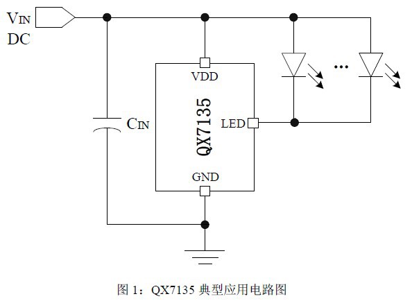 除 LED 外,QX7135 无需外接其它元器件即可构成一个恒流输出的LED驱动电路。