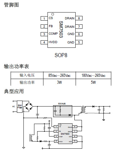 功能表述:SM7503 芯片是应用于离线式小功率AC/DC 开关电源的高性能原边反馈控制功率开关芯片,