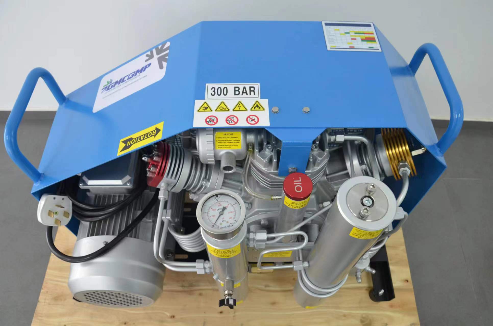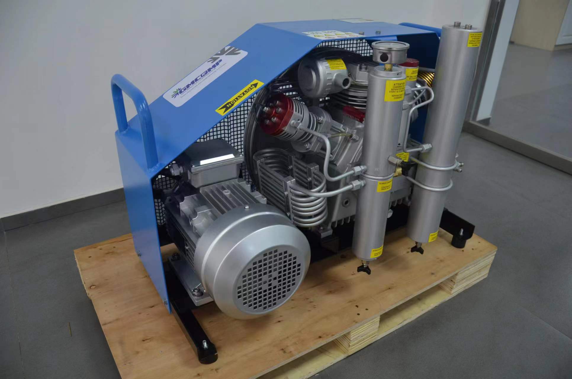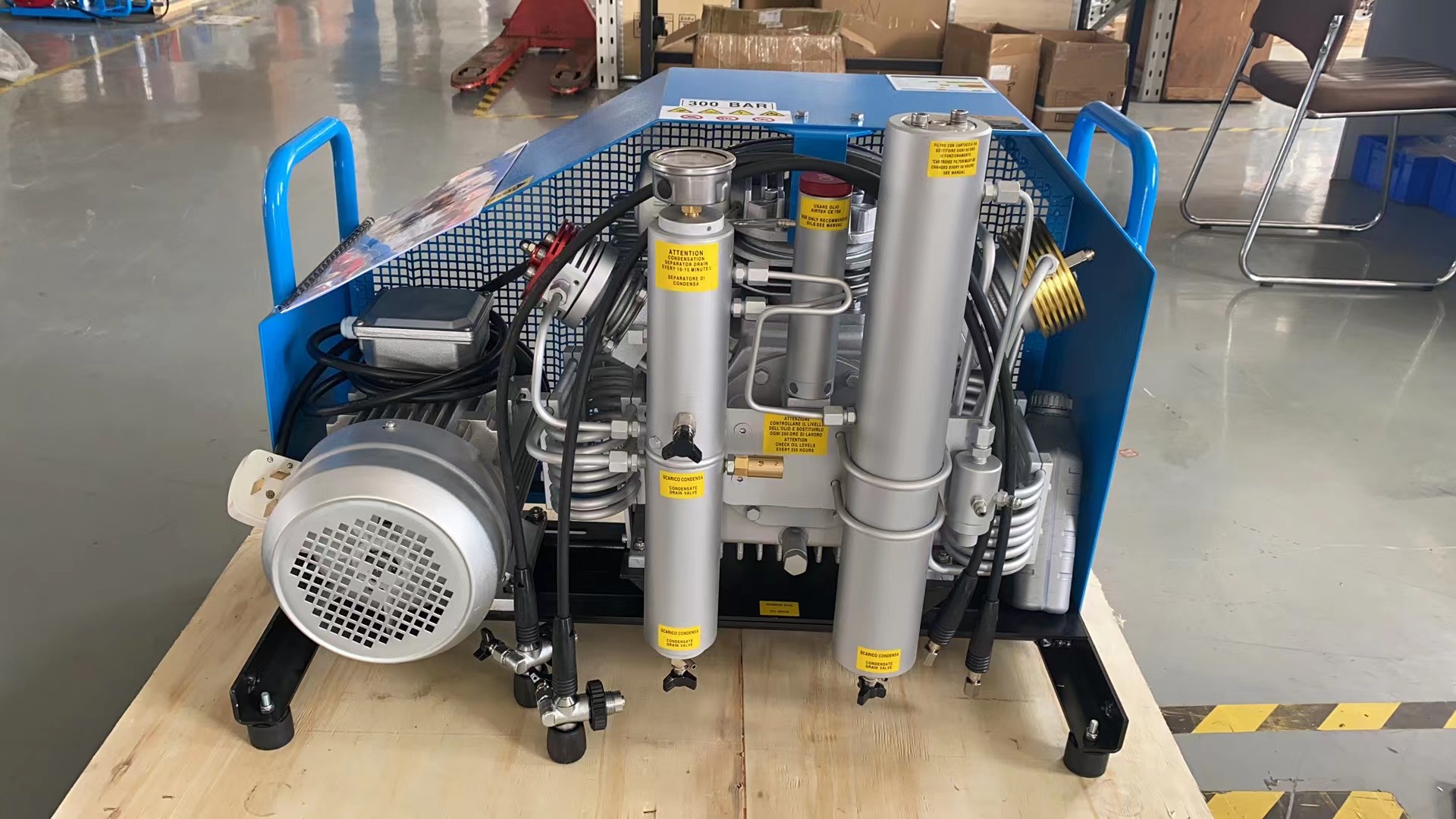 空气经过空气过滤器进入一级气缸,将空气压缩到5BAR的压力,压缩后的空气经冷凝后进入第二级,第二级将压缩后的气体再次增压到40BAR,压缩后的空气经过二级冷却器,冷却后的空气进入凝结器,并定时将凝结水排出,空气再经过三级气缸增压,直接将空气压缩机所需的的压力(225或300BAR),压缩后的高压气体经过冷却器后进入三级冷凝器,并定时排出冷凝水,冷却并除水的空气进入活性碳分子筛过滤器后,干净纯洁的空气通过充气软管排出。