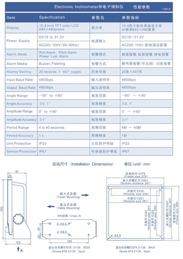 电子倾斜仪IM330是为了帮助船舶在决策过程中避免危险情况,以及为海事机构提供船舶摇摆周期和倾角信息,以协助促进其对意外调查的设备。它不仅可以实时地测量船舶横摇和纵的角度,计算出幅与周期 ,并传送给VDR以保存船舶航行信息。还具有报警功能,供长、员驾驶时参考,以防止船舶出现危险姿态,同时可以将超限制范围的横纵摇角度及日期、时间、经纬度记录下来,在需要时可查看历史。