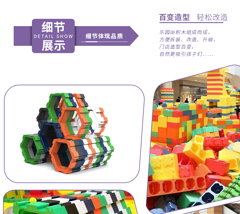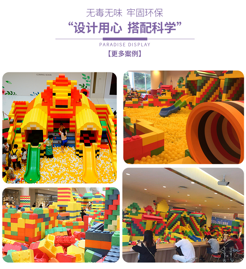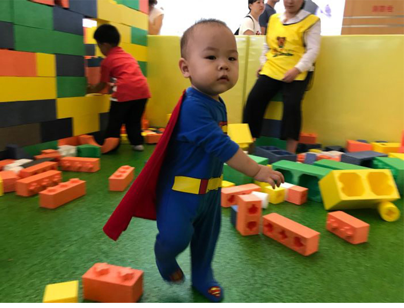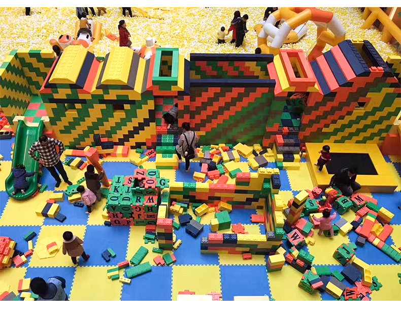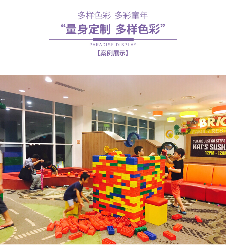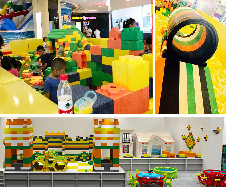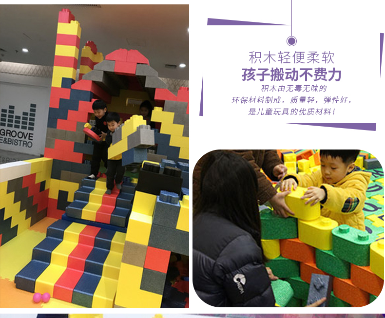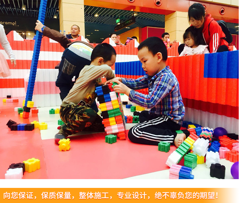 一进大门小孩子们就被多彩造型的太空沙桌迷上,太空沙桌造型奇特、色彩鲜丽,再搭配上多种色彩的太空沙。太空沙是一种可以塑造任意造型都不脏手的泥,能做出各种各样的形状,星星、月亮、房子、金字塔。这比我们小时候玩泥巴就高级多了。太空沙是每一个小孩子必玩项目,他们每次都乐此不彼。巨型积木乐园小孩子的建筑天地,发挥各种各样奇特的想法,搭建出自己心目中满意的造型。