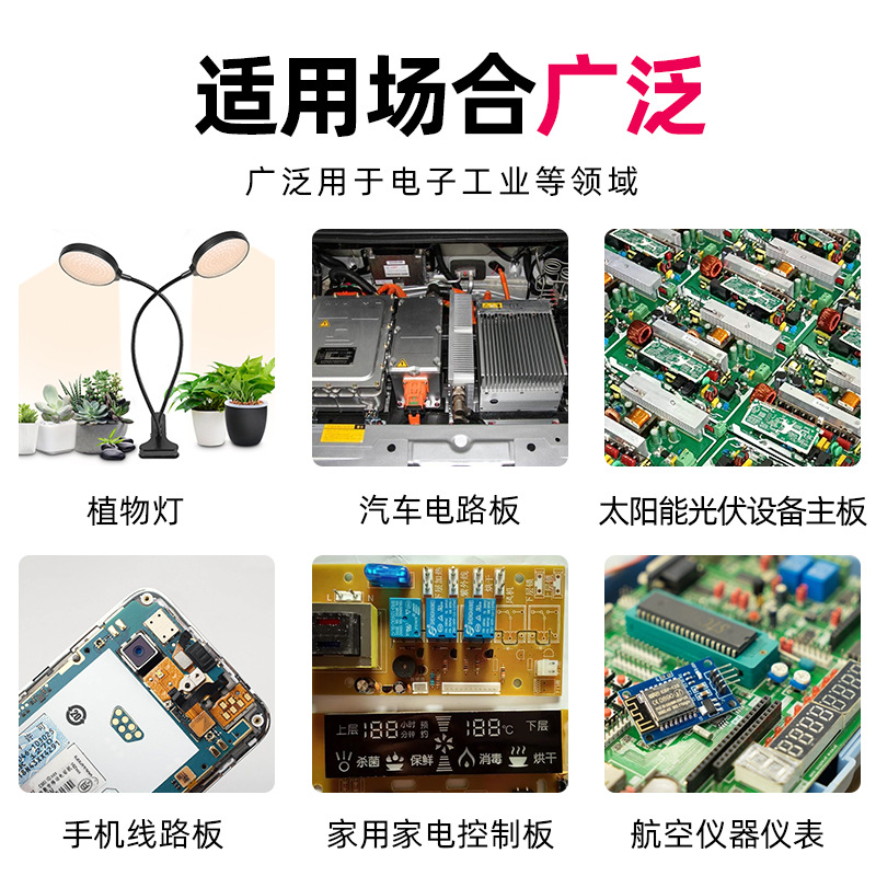 三防漆的应用范围非常广泛。最初,它主要应用于高科技领域的印刷线路板。然而,随着电子装置在日常生活中的应用越来越广泛,消费者对产品的质量和可靠性也越来越关注。因此,三防漆现在已经被广泛应用于各种民用和商业电子设备中,如洗衣机、洗碗机、卫浴产品、户外电子LED屏、显示屏、防盗和防火报警装置、空调、干燥器、计算机、电磁炉等。此外,在汽车行业、航空航天领域以及航海领域,三防漆也发挥着重要的作用,保护着汽车电子装置、航空电子设备和船舶电器线路免受恶劣环境的侵害。