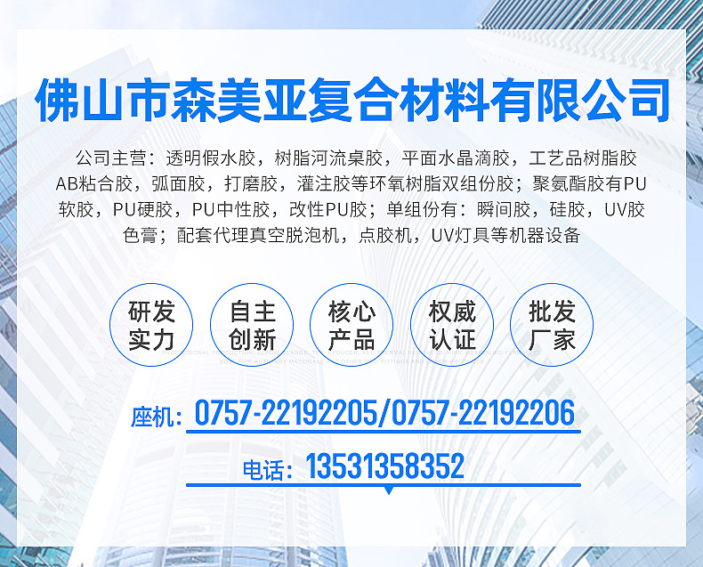 ?? 佛山市森美亚复合材料有限公司是一家从事工艺化工胶水的生产型企业,经营:大韩水晶AB胶,相片、相框水晶胶,平面水晶滴胶,LED软灯条胶,PU水晶胶,AB粘合胶,弧面胶,打磨胶,假水,灌注胶等环氧树脂胶;单组份有:瞬间胶,UV胶,色膏,色浆;并代理真空脱泡机,点胶机,UV灯具等配套设备。公司始终坚持“以质量求生存、以创新求发展”的经营理念;“以市场为导向、以技术为保障、以信誉赢客户”为宗旨;不断开拓新的市场领域。