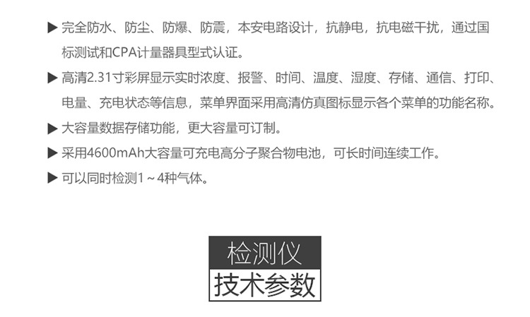 | 检测方式 | 内置泵吸式,流量500毫升/分钟 |