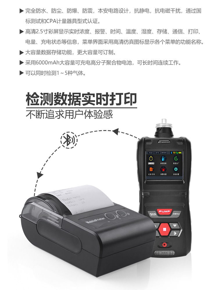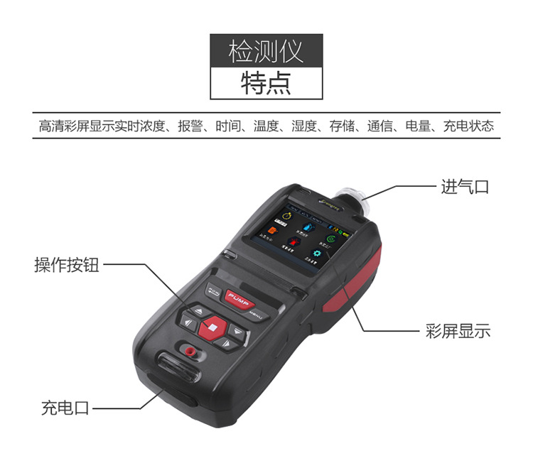 | 检测方式 | 内置泵吸式,流量500毫升/分钟 |