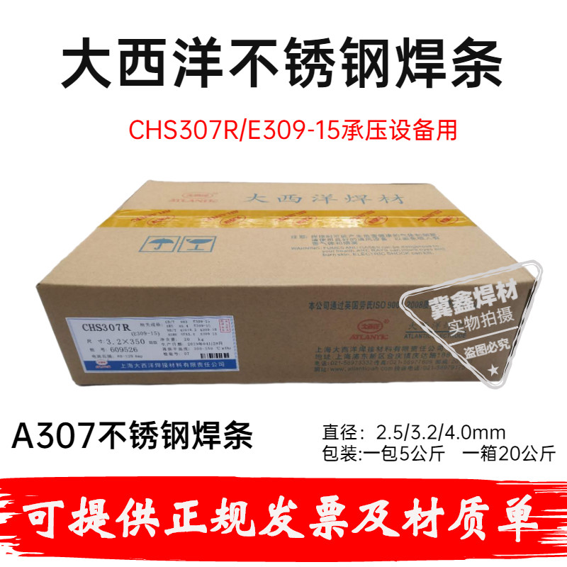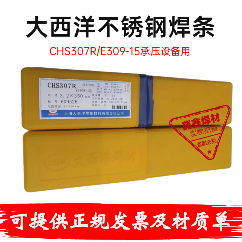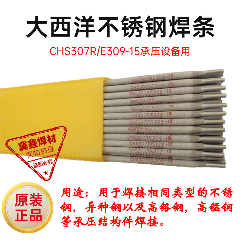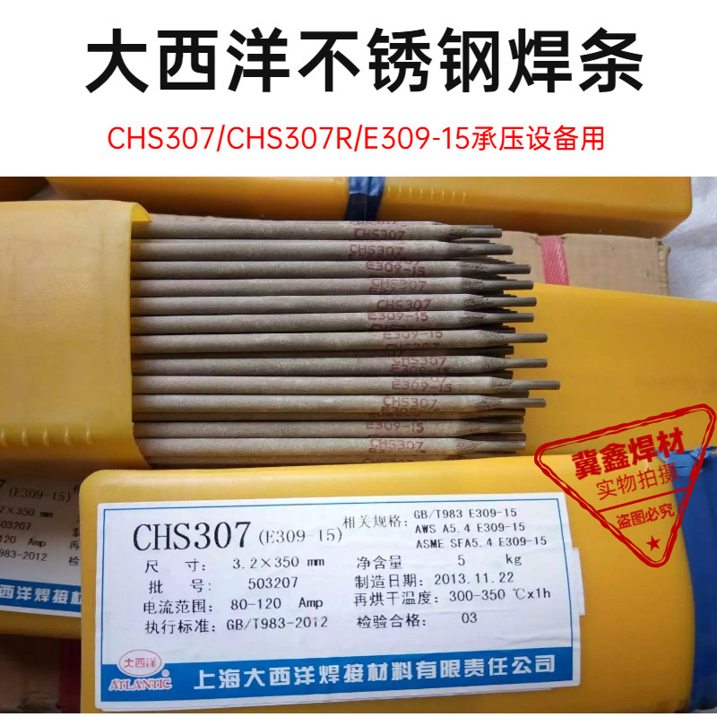 符合:JB/T 4747 E309-15 GB/T 983 E309-15 ASME SFA-5.4 E309-15 EN 1600 E 22 12 B 4 2 ISO 3581-A-E(22 12)B 4 2 ISO 3581-B-ES309-15说明:CHS307是碱性型药皮类型的不锈钢焊条,焊缝金属具有优良的抗裂性以及抗氧化性能。采用直流反接,可进行全位置焊接。用途:用于焊接相同类型的不锈钢,异种钢以及高铬钢,高锰钢等承压结构件焊接。
