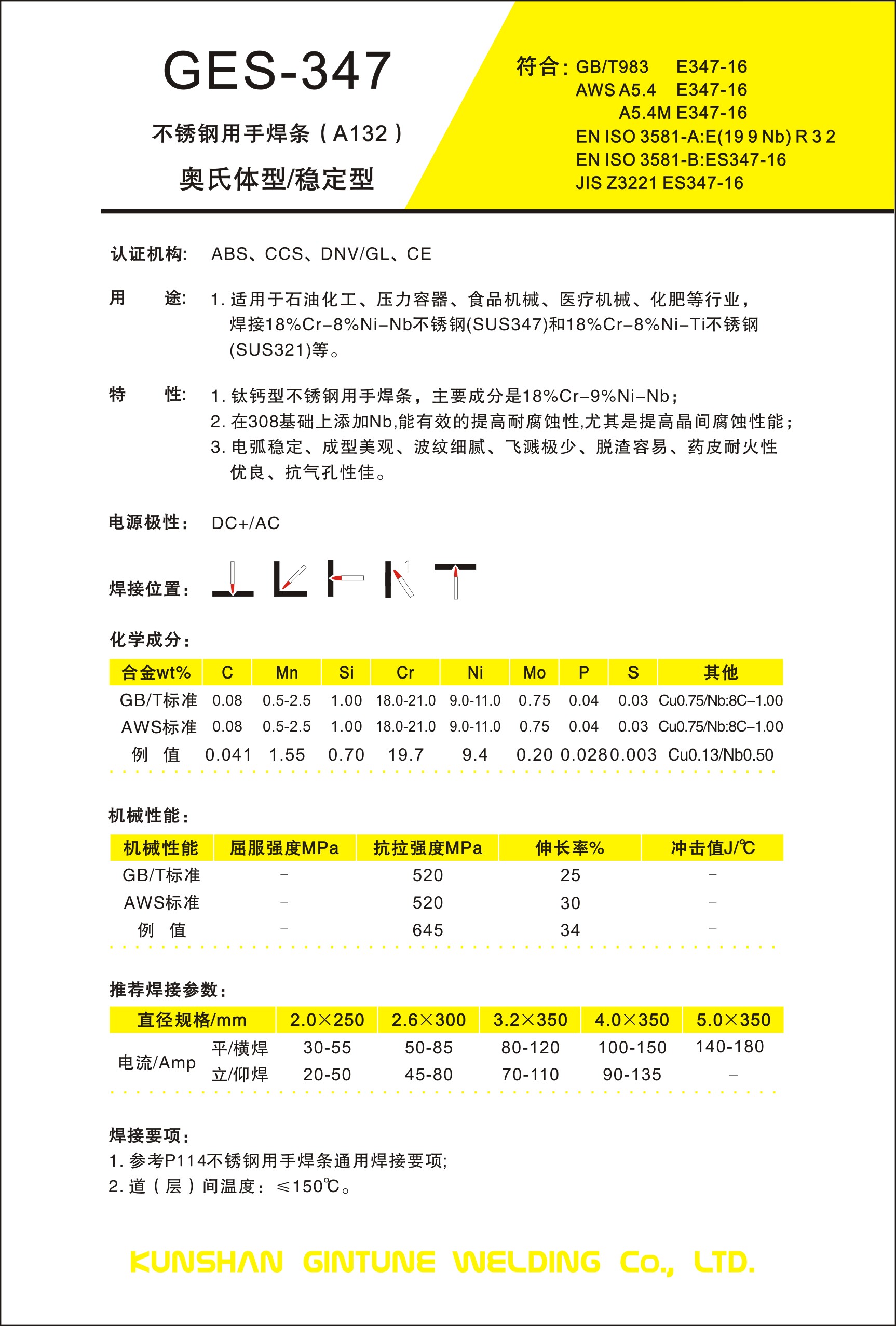 说明:GES-316L主要成分是低C-18Cr-12Ni-2Mo,可采用交直流电源,全位置焊接。焊接作业性--电弧稳定、成型美观、波纹细腻、飞溅少、脱渣容易;药皮耐火性优良,抗气孔性佳,熔敷金属的机械性能稳定、X-Ray合格率高。耐腐蚀性能优异。