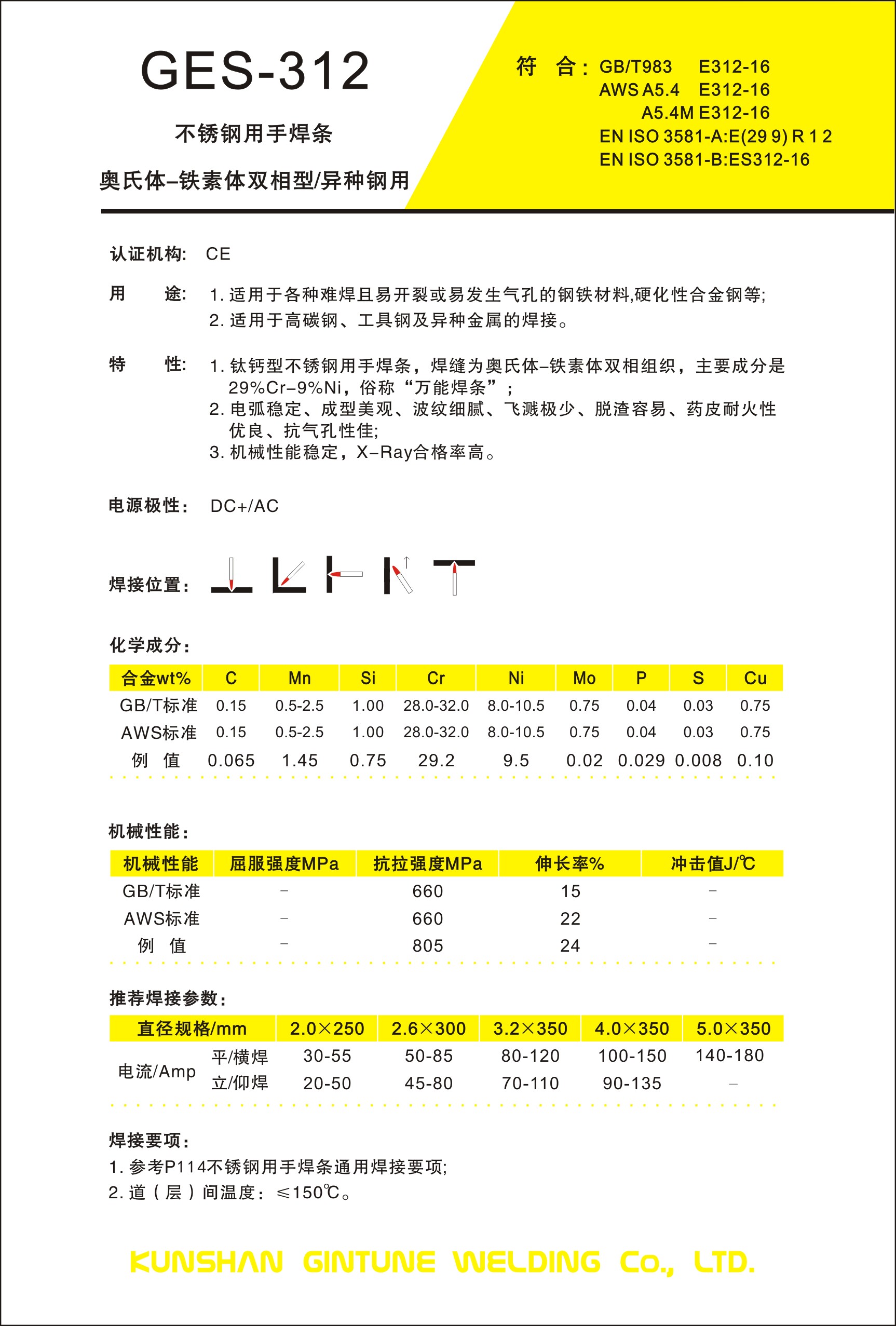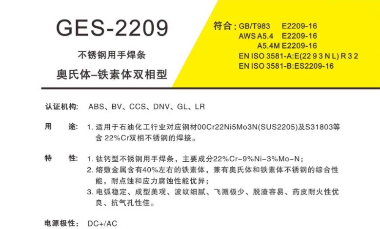 用途:GES-309主要成分是22Cr-12Ni,可采用交直流电源,全位置焊接。焊接作业性--电弧稳定、成型美观、波纹细腻、飞溅极少、脱渣容易;药皮耐火性优良、抗气孔性佳、熔敷金属的机械性能稳定、X-Ray合格率高。常应用于碳钢与不锈钢异材焊接或韧性较差的马氏体、铁素体不锈钢焊接。应用场合如石油化工、火力电站等行业。
