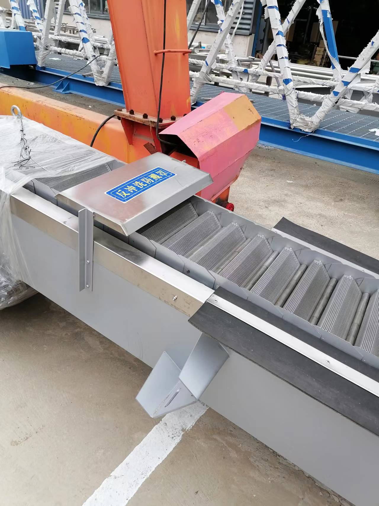 耙齿链运转到设备的上部时,由于槽轮和弯轨的导向,使每组耙齿之间产生相对自清运动,绝大部分固体物质靠重力落下。另一部分则依靠清扫器的反向运动把粘在耙齿上的杂物清扫干净。