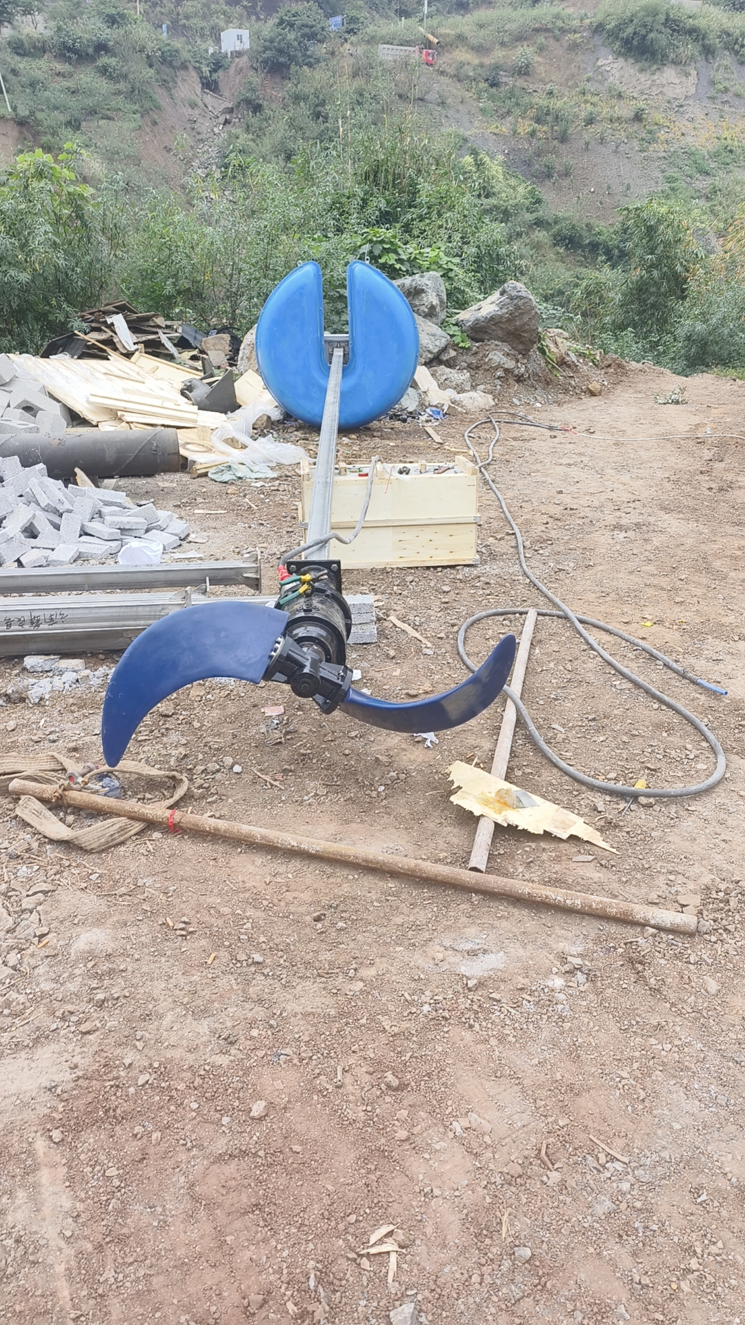 ⑷.用吊具拴牢浮筒注意平衡,不能直接吊在包箍耳环。用起吊设备将整机徐徐吊起,慢慢放入池水中,解开吊具,用蝇索将其轻轻的拉到池中位置,浮筒以四角对四池边的菱形位置摆放。然后把钢丝绳微微拉紧,目测对边的两根钢丝绳在一条直线上,四根钢丝绳所形成的两条直线交叉垂直且与浮筒四边成垂直状,沿着钢丝绳的方向,在池壁顶端坚固位置钻孔,用膨胀螺栓将地桩固定好,调整四边钢丝绳长度,注意考虑水位可能下降的幅度,放出足够的余量,夹好夹头,用卸扣固定在地桩上。在整吊装过程中,始终要注意保护电缆,决不允许用潜水搅拌机电缆起吊、悬挂搅拌机。