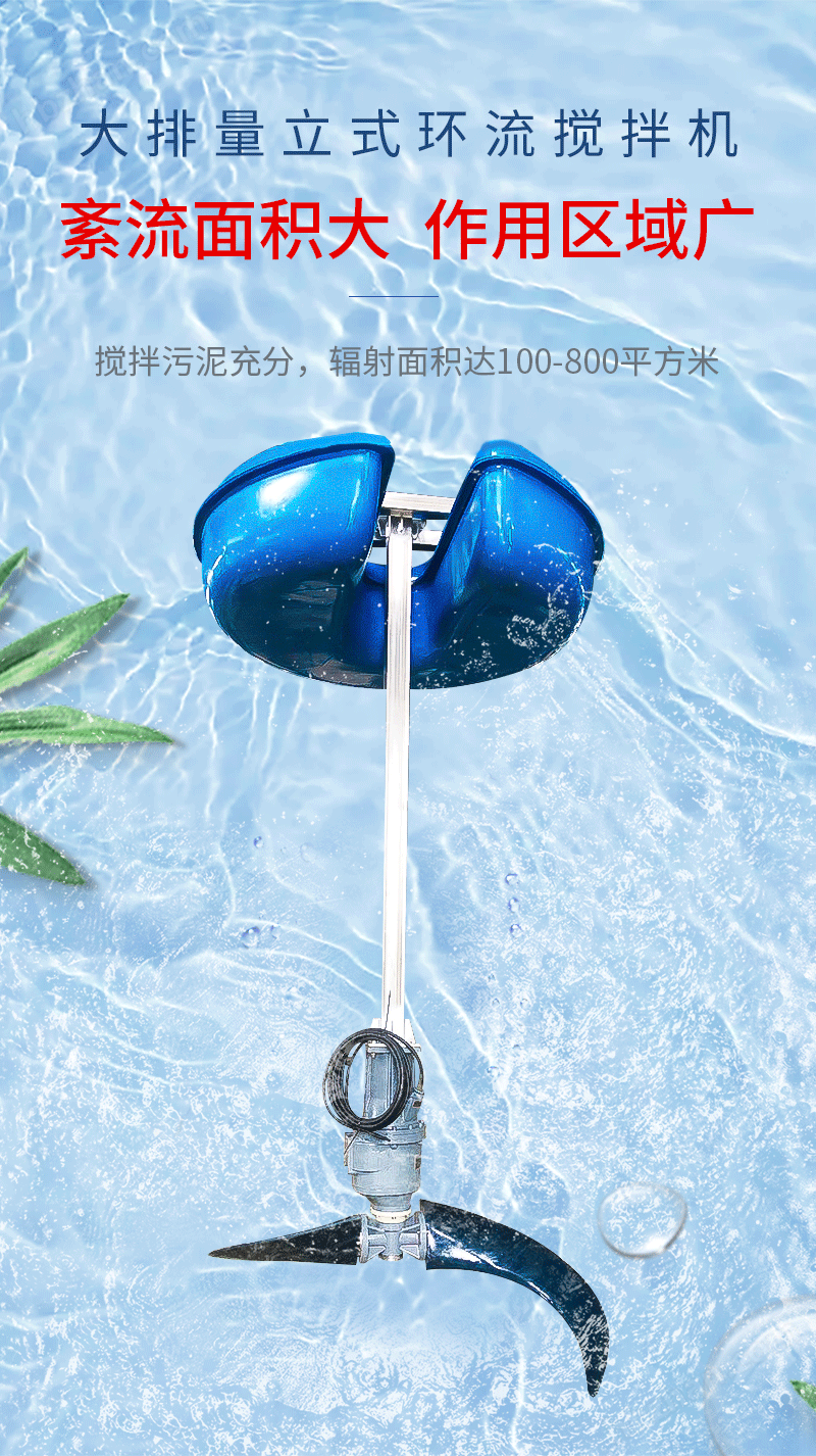 低速立式环流搅拌机QFJ2.2LHJ型立式环流搅拌机,采用大排量、螺旋浆式的推进叶轮、叶桨作为主要水力部件,运行时潜水电机带动推进式叶轮、叶桨工作,使流体产生流速和流场,向水池底部和四周形成环状主流带。因为主流带流速较大,形成了以其为中心的紊流区域,促使整个水体形成上下翻动的大循环,从而实现大面积立体环流搅动,使池中污泥始终处于翻动和悬浮状态,达到了均匀、温和搅动的目的,提高了处理效果。