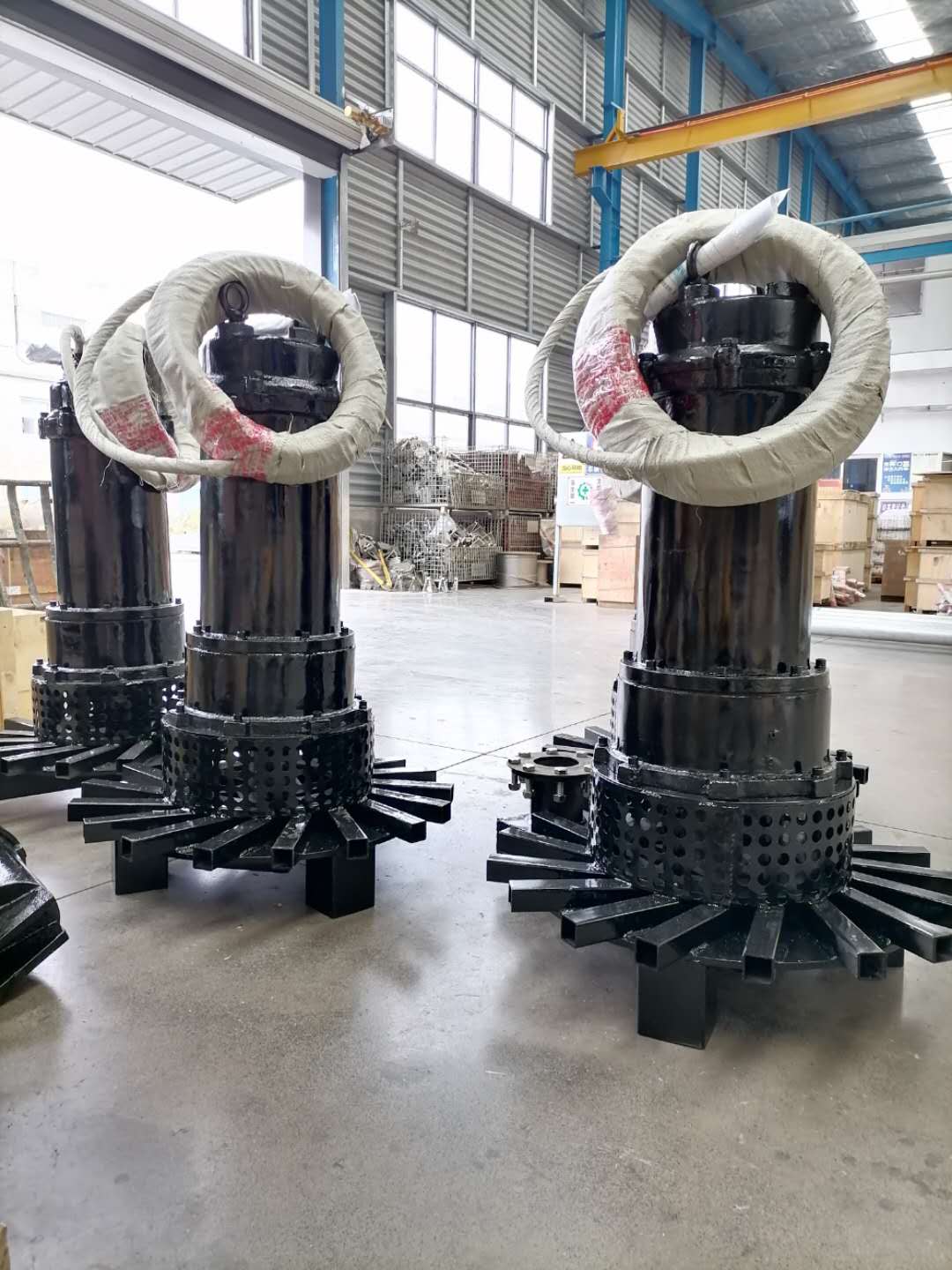 潜水离心式曝气机的结构为直联式,产品为自吸式曝气,高速旋转的叶轮产生的离心力,在叶轮进口处形成强的负压吸入空气和水,在混合室里将一定比例的气水混合,在强大的离心力作用下,沿叶轮的切线方向经流道喷射而出,向圆周方向扩散,使水流成对流循环,而细碎的微小气泡其比表面积大,上升速度缓慢,保证充分与水混合,从而达到充氧曝气的效果。