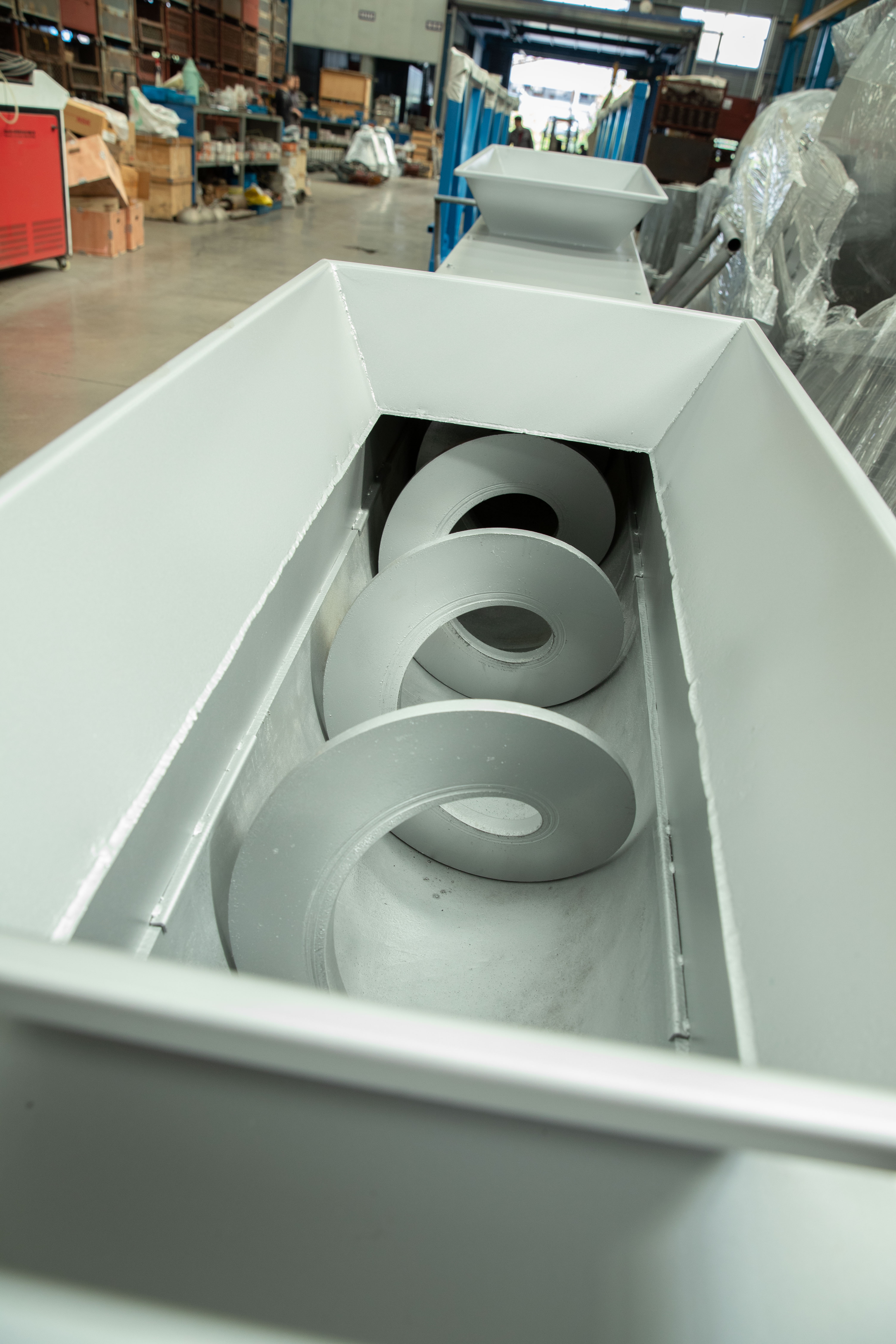 无轴螺旋输送机的结构主要由动力装置、头部装配、机壳、无轴螺旋体、衬板、进料口、出料口、机盖(需要时)、底座等组成。