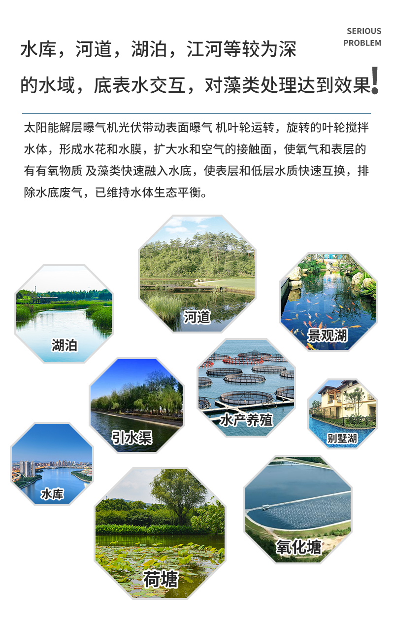 太阳能解层曝气机由光伏板组件、蓄电池组、表面曝气机,浮体、支架等主要部件组成,光伏带动表面曝气机叶轮运转,旋转的叶轮搅拌水体,形成水花和水膜,扩大水和空气的接触面,使氧气和表层的有有氧物质及藻类快速融入水底,使表层和低层水质快速互换,排除水底废气,已维持水体生态平衡。